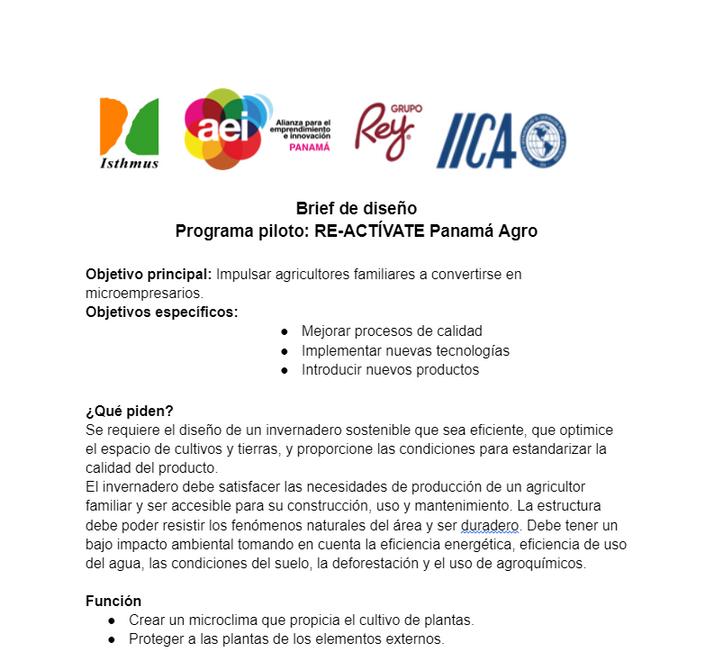 Para su desarrollo tomamos la carta donde la AEI hace invitación a Isthmus para participar en el proyecto. Donde denotan los objetivos globales del proyecto RE-ACTÍVATE Panamá Agro y especifican lo que esperan que les brinden los invernaderos propuestos por la Escuela. Identificamos esta información, la detallamos y luego profundizamos en base a nuestra investigación, las funciones con las que debe cumplir y responder preguntas como: ¿A quién nos dirigimos? y ¿Cuáles son los retos y problemas que podríamos encontrar durante el desarrollo del proyecto?