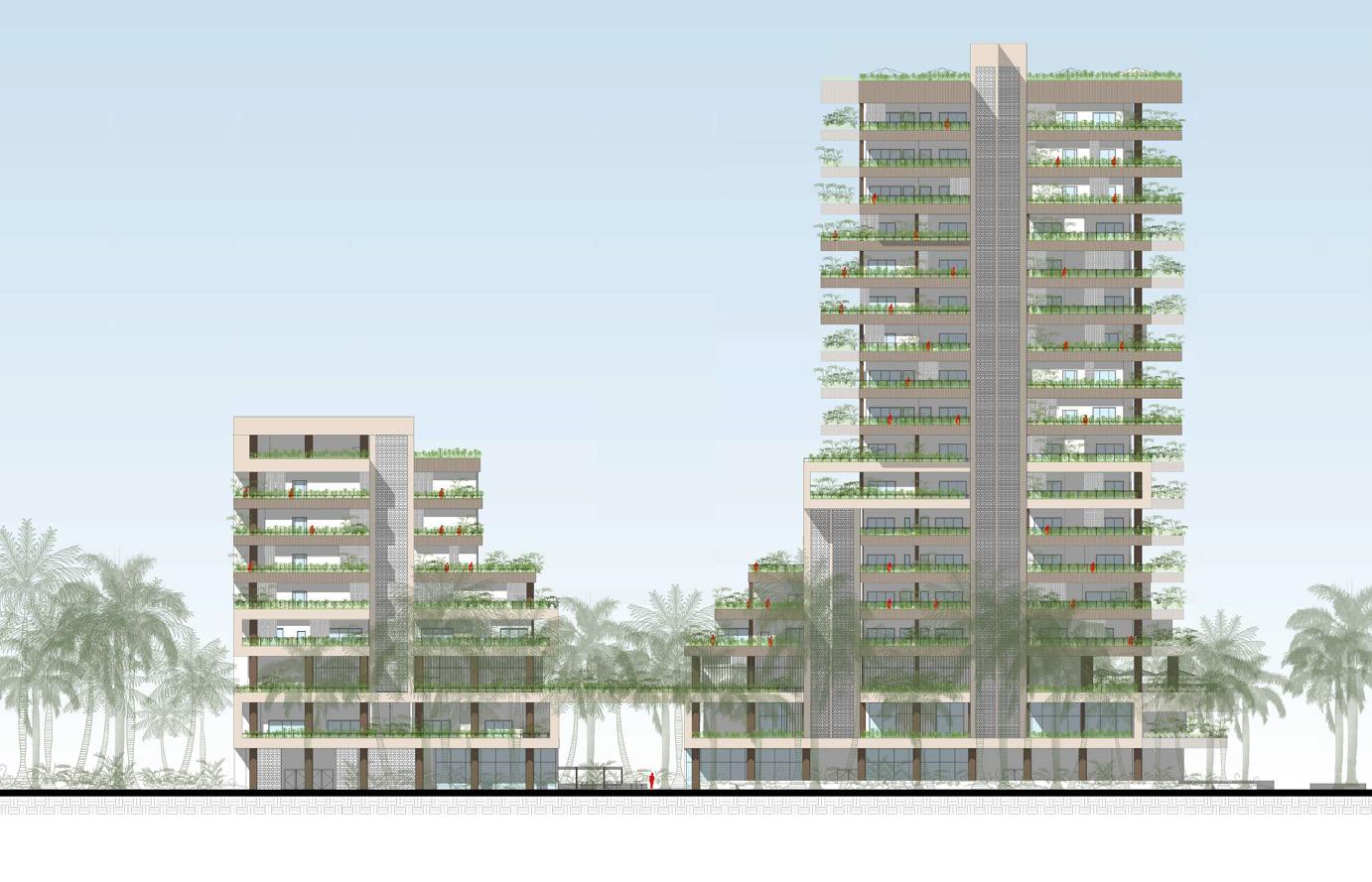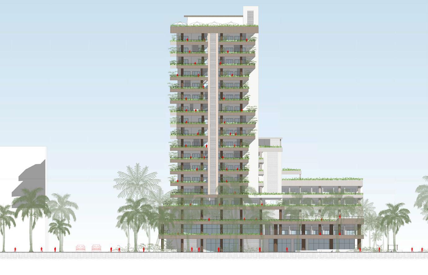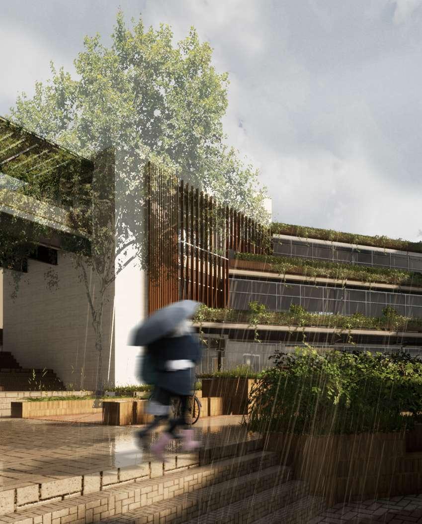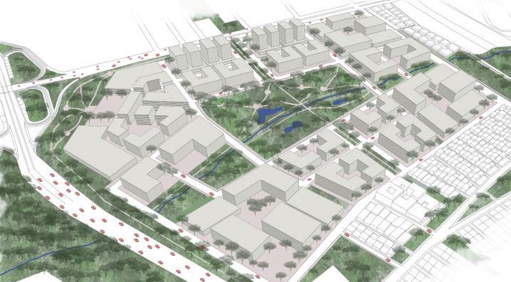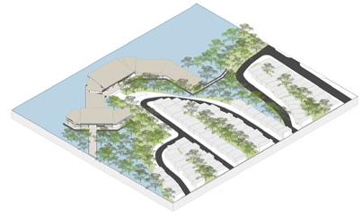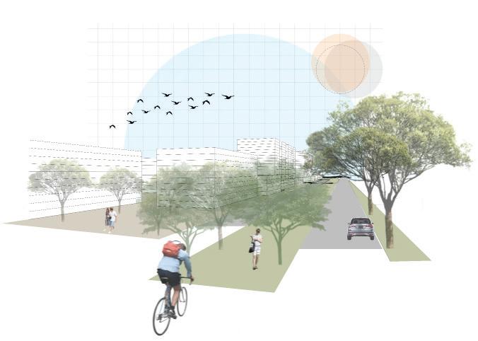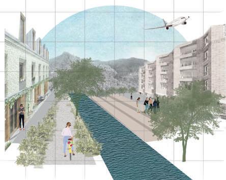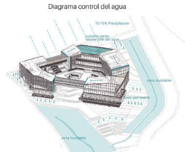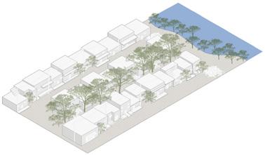 urbanístico que busca que retener los rellenos, aumentar la cobertura verde y resguardar en caso de aumento del nivel del agua Desarrollo tipológico que busca tener una orientación óptima para la ventilación cruzada y tener menos horas al día de sol directo en las fachadas más largas.