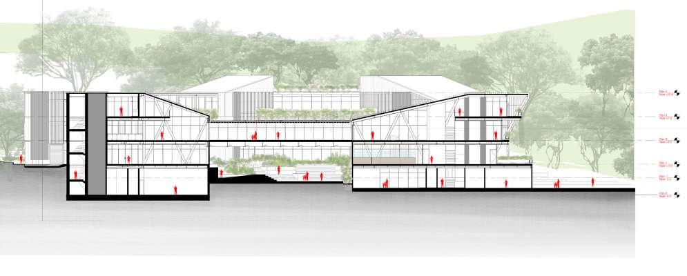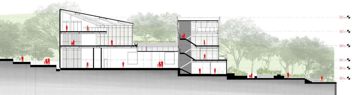 Desarrollo de interiores Para los espacios interiores fue importante tener en cuenta la topografía y usarla como un factor que definiría los niveles del proyecto. Las visuales definidas en el proyecto se componen por 2 factores. El primero es la relación visual con la plazoleta de acceso y . Por otra parte, existe la relación visual con los elementos preexistentes intervenidos en el sector, que se encuentran a distancias medias y lejanas como las afluentes de agua, los cerros orientales y la ciudad.