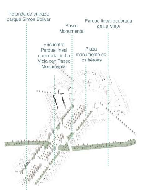 Plaza monumento de los héroes Encuentro Parque lineal quebrada de La Vieja con Paseo Monumental Rotonda de servicio Calle 80, Autopista norte, Av Caracas, Paseo Monumental