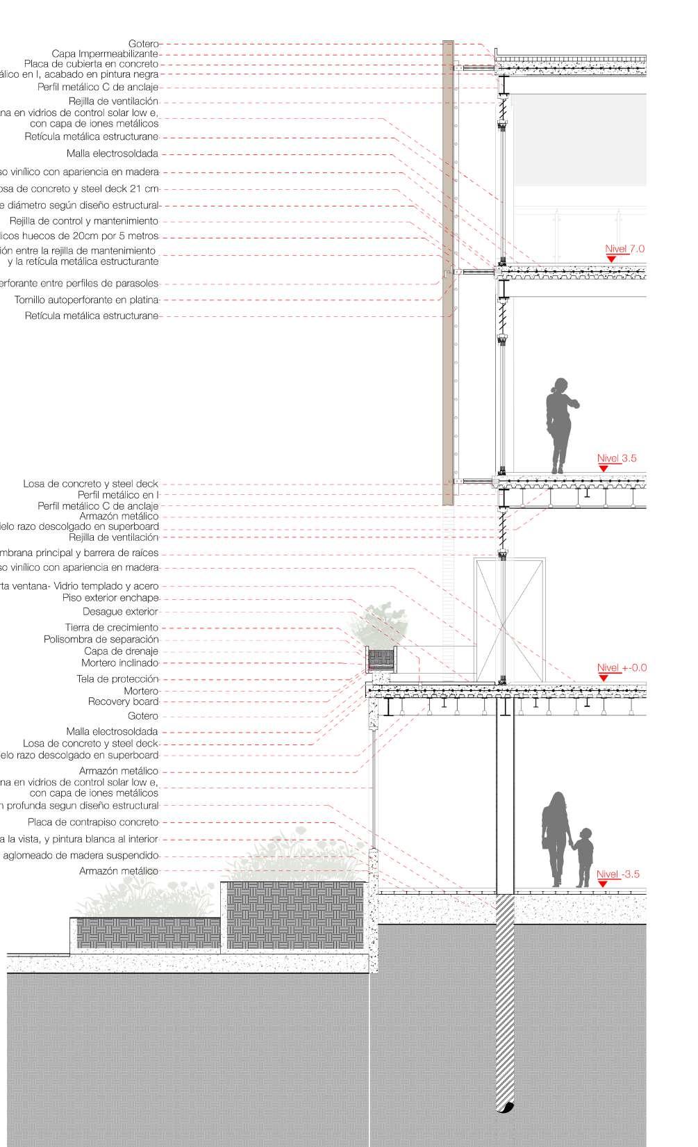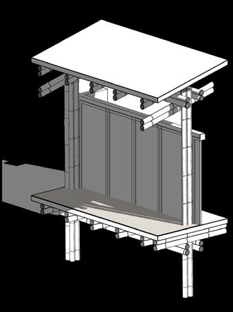 Tornillo en acero inoxidable Soporte en acero para unión de partes Vigas en guadua Perfil en acero en c reforzar las uniones Relleno de concreto para estabilizar la estructurra Marco en madera para el soporte de percianas Perciana vertical en madera Muro en drywall para exteriores