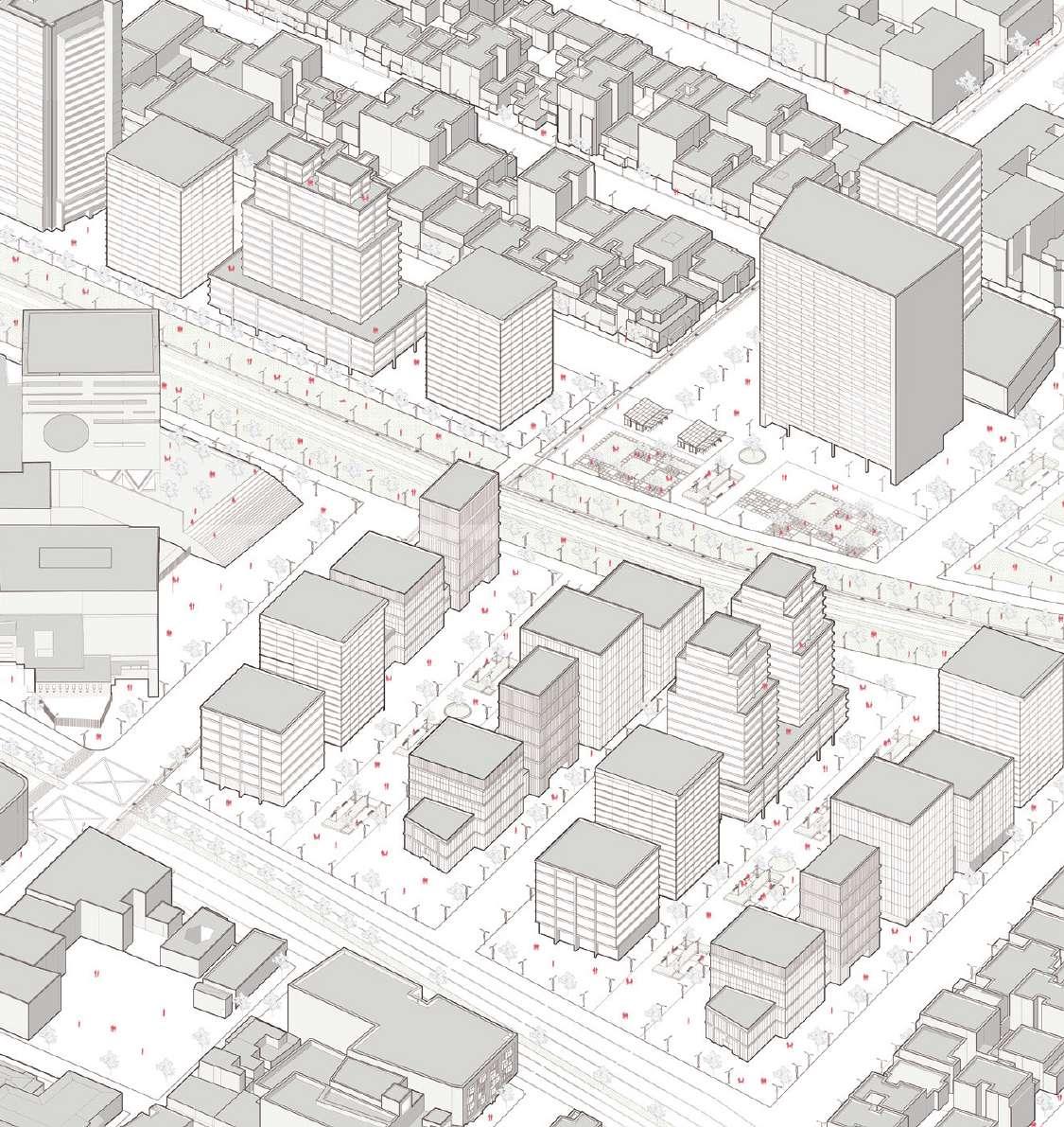 En consecuencia, los dispositivos planteados, tienen como objetivo complementar un hecho de transversalidad en las dinámicas, y conectar la generalidad del sector, para llegar a una activación a nivel metropolitano. En este sentido, el dispositivo para densificación de usos es un edificio mixto sobre la carrera 9. En segundo lugar, el dispositivo con el objetivo general de distribuir y conectar dinámicas, priorizando el nivel peatonal es el parque sobre la carrera 9. Por ultimo, el dispositivo que tiene como propósito complementar la modificación de movilidad del sector, es la estación del tren.