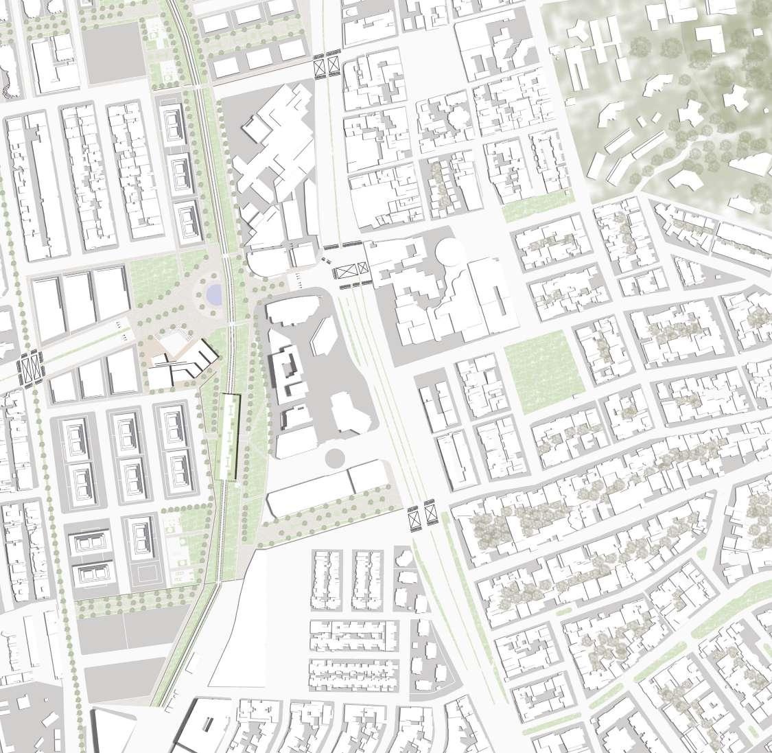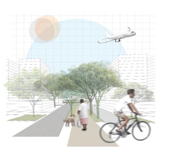 El planteamiento tiene como objetivo principal determinar como se transforma un sector con la inserción de una nueva vía de escala metropolitana e infraestructura como lo es una vía férrea subterránea. Fue determinante para el planteamiento identificar cuales vías en el sector son de escala urbana, para generar una continuidad geométrica. De igual forma, se plantea un perfil en el que la vía se separa por un sector para vehículos no motorizados y sendero peatonal, luego tiene carriles vehiculares y finalmente tiene andenes y edificios que generan actividades de interés metropolitano. Posteriormente, se genera un parque lineal que remata el nuevo tejido, para generar una continuidad ambiental y funcional, que ayuda a articular las actividades de escala local, que actualmente se encuentran en el sector y las actividades de escala metropolitana, que se plantean con la nueva tipología de edificios. trabaJo en gruPo