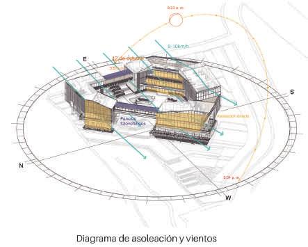 Estrategias de fachadas Las fachadas tienen 4 componentes que surgen del análisis de asolación. el edificio se dispone estratégicamente para recibir la factores de temperatura y luminosidad. Para los espacios que necesitan poca iluminación, se utiliza un sistema de parasoles interior. En las partes en que se necesita de buena iluminación, pero están muy expuestas a la asolación, se genera un sistema de pero al mismo tiempo se tenga un confort térmico y de iluminación. Por ultimo se usa un sistema de muros cortinas, para completar exposición directa a los rayos del sol pero requieren de iluminación adecuada, en los que se utiliza vidrio doble con iones metálicos