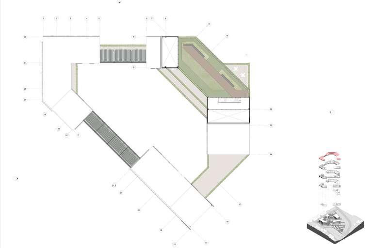 Catalina Chaves Posada Resignificando la cienaga: Centro de conciencia y cuidado ambiental 2/5 Dentro de la forma se desarrolla el programa en volumen El volumen del equipamiento parte del análisis del crecimiento hacia la ciénaga que no tiene limites marcados Se determina un limitela importancia de marcar un limite Se determina un limite de resguardo ambiental para el borde. Se establece en planta una forma que de importancia al barrio. Se da importancia a la ciénaga por medio de las cubiertas.