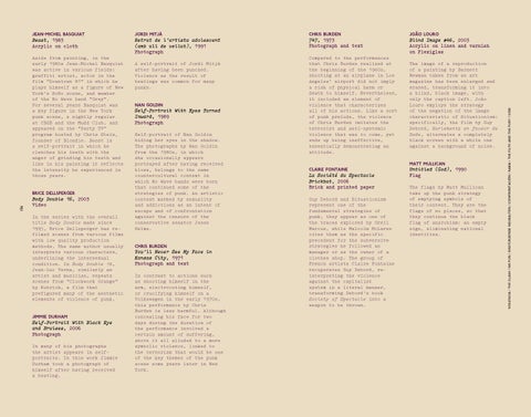 Chris Burden You’ll Never See My Face in Kansas City, 1971 Photograph and text In contrast to actions such as shooting himself in the arm, electrocuting himself, or crucifying himself on a Volkswagen in the early 1970s, this performance by Chris Burden is less harmful. Although concealing his face for two days during the duration of the performance involved a certain amount of suffering, above it all alluded to a more symbolic violence, linked to the terrorism that would be one of the key themes of the punk scene some years later in New York.