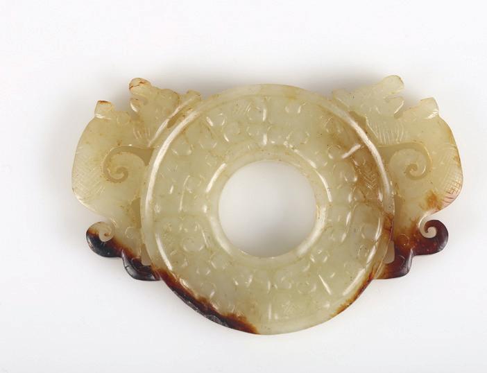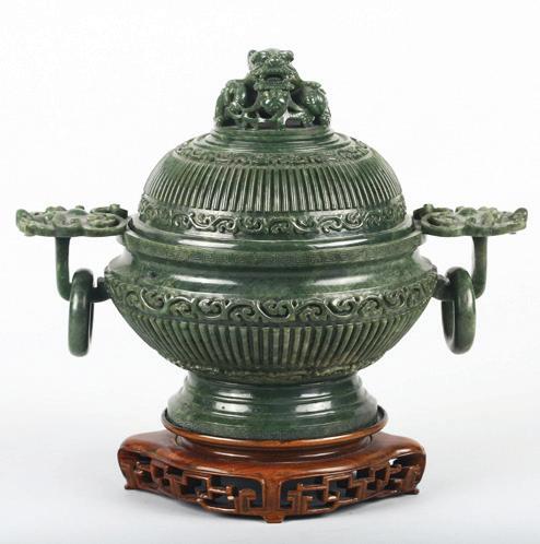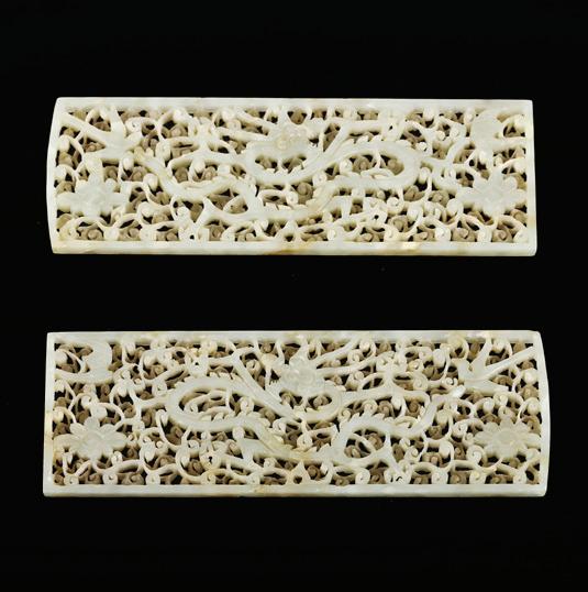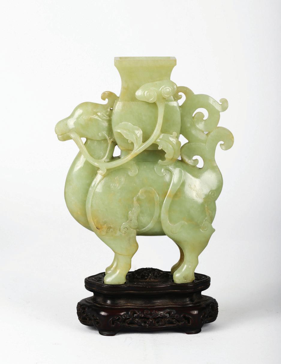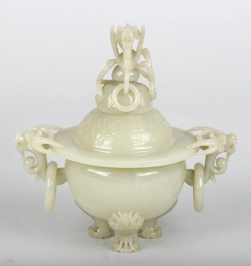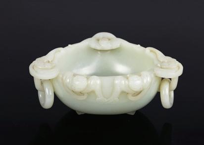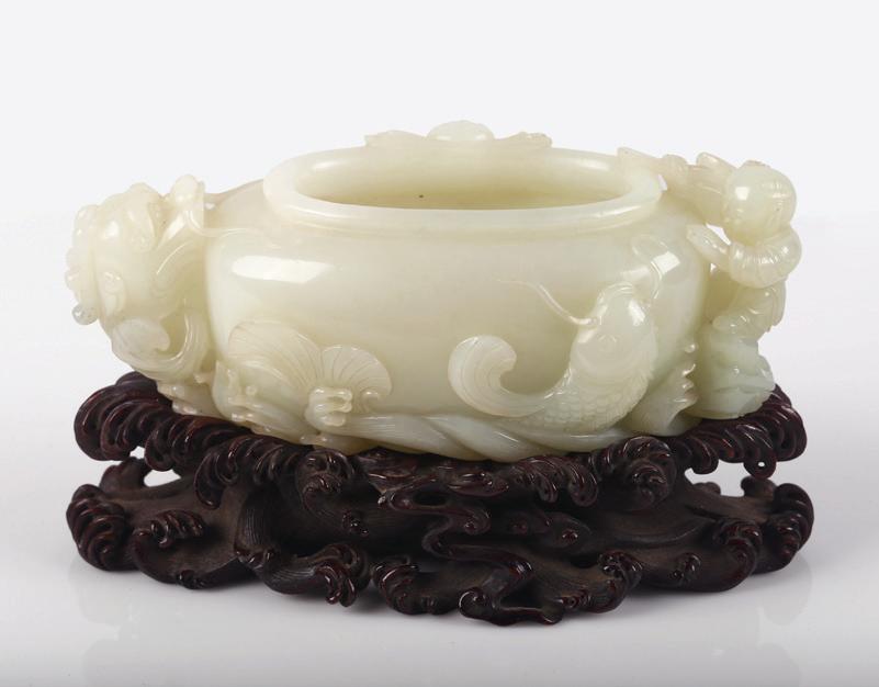 Of circular section, the rounded sides supported on a short straight foot, flanked by a pair of openwork handles in the form of a chilong, the stone is of even polished white tone.