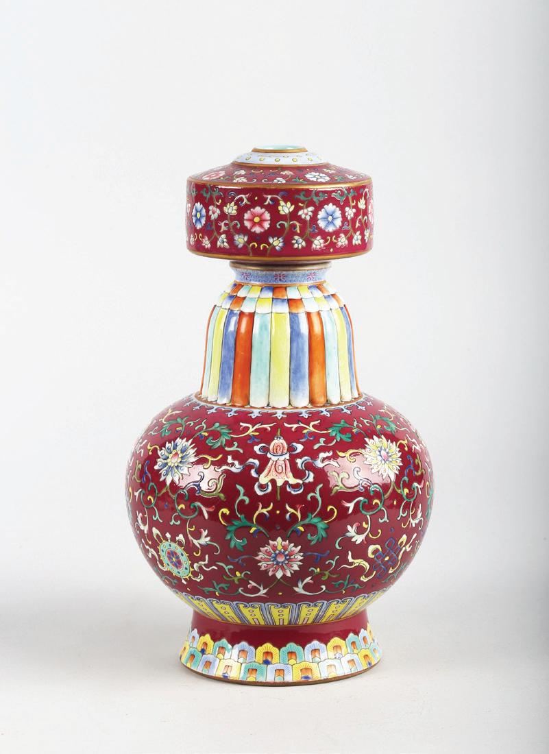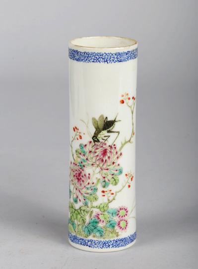 The deep rounded side rising from a straight foot to an everted rim, enamelled around the exterior in varying tones pink with overlapping leafy stems of flowers, the base with a six-character reign mark within a double circle in underglaze blue.