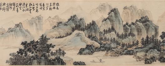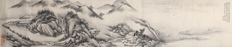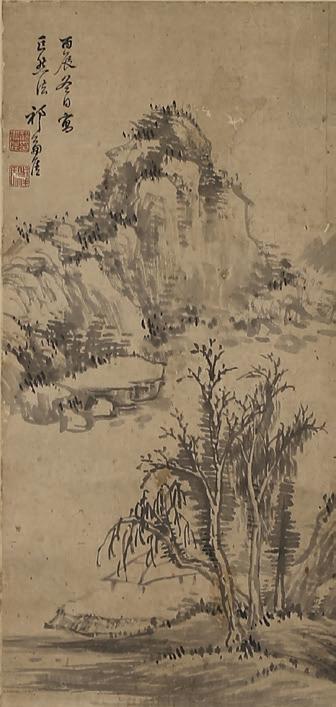 Depicting a snowy mountainous landscape with figure, trees, and huts. Republic period.