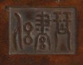 Of square section, surmounted with a seated buddhist lion, side inscribed, the seal face carved with nine characters. Qing Dynasty or Republic period.