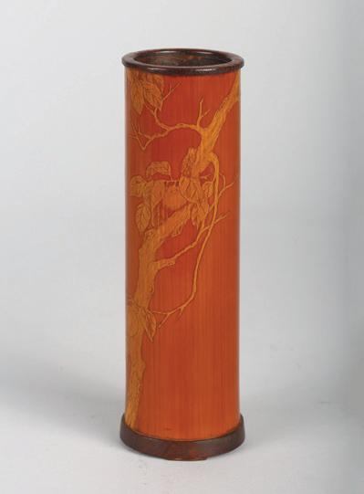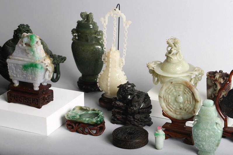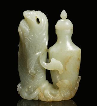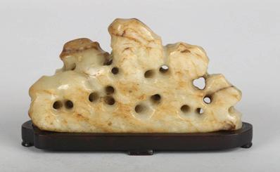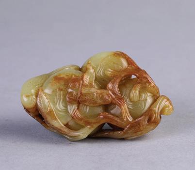 The jade is intricately carved with persimmons and leafy lingzhi fungus, with a bird perched on one of the persimmons. The stone is of yellow tone with russet areas. Qing Dynasty period.