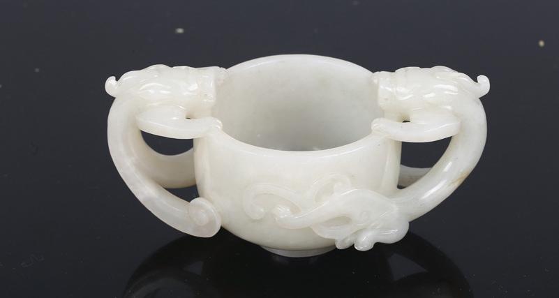 清 白玉雙龍耳杯
