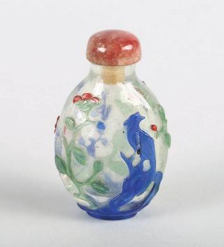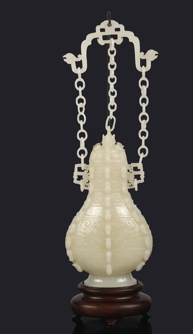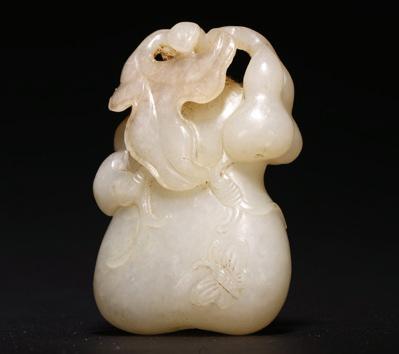 Qing Dynasty period. Carved in the form of a double gourd borne on gnarled leafy vines suspended with smaller double gourds, the stone of an even white tone.