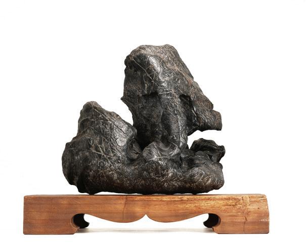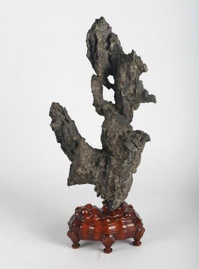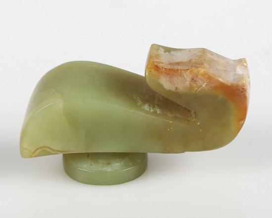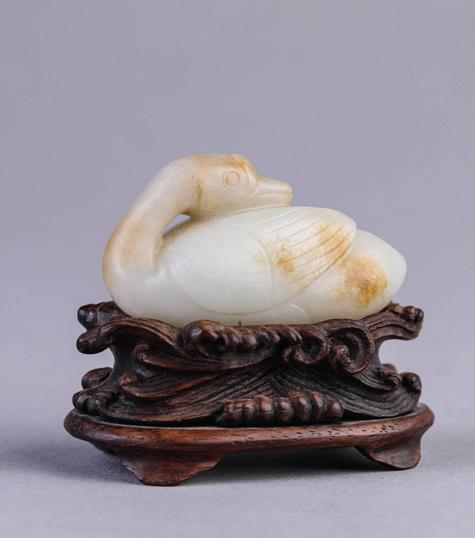 Carved with the head turned backwards, its carefully defined feet tucked beneath its body, the stone is of attractive white tone with russet inclusions. Hardwood stand. Ming Dynasty period.