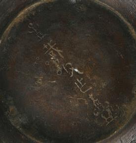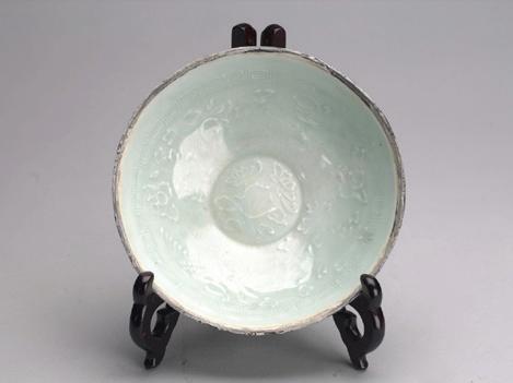The interior of the shallow dish impressed with a design of six birds in flight surrounded by six cloud motifs, supported on three twisted rope feet. Tang Dynasty or later.