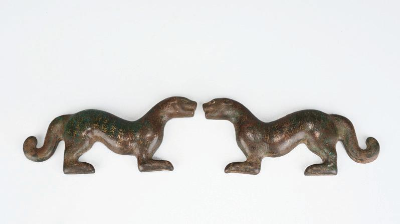 The beast cast seated with large bushy tail and right paw raised and resting on a ribbon-tied brocade ball, the head with large bulbous eyes and jaws wide open to reveal the sharp teeth, the metal patinated to a dark blackish-brown tone. Qing Dynasty period.