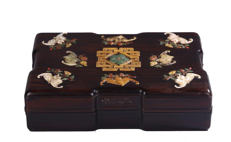 The box cover finely inlaid with mother-of-pearl, jade, agate, and soapstones to depict eight bats grasping floral sprig in mouth surrounding flowerhead enclosed within a knot.
