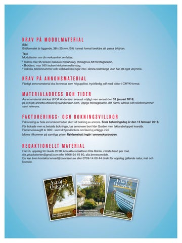 R E D A K T I O N E L LT M A T E R I A L Har Du uppslag för Guide 2018, kontakta redaktören Rita Rohlin, i första hand per mail, rita.ystadosterlen@gmail.com eller 0766-24 15 60, alla ämnesområde. Du kan även kontakta lennart@orvarsson.se eller 0709-14 00 44 direkt för uppslag gällande natur, mat och boende.