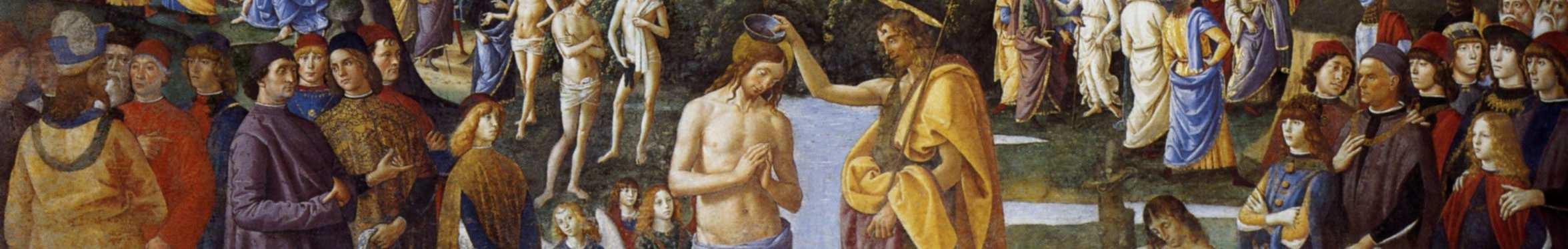In this 1482 fresco in the Sistine Chapel, Pietro Perugino depicts Saint John baptising our Lord in the Jordan.