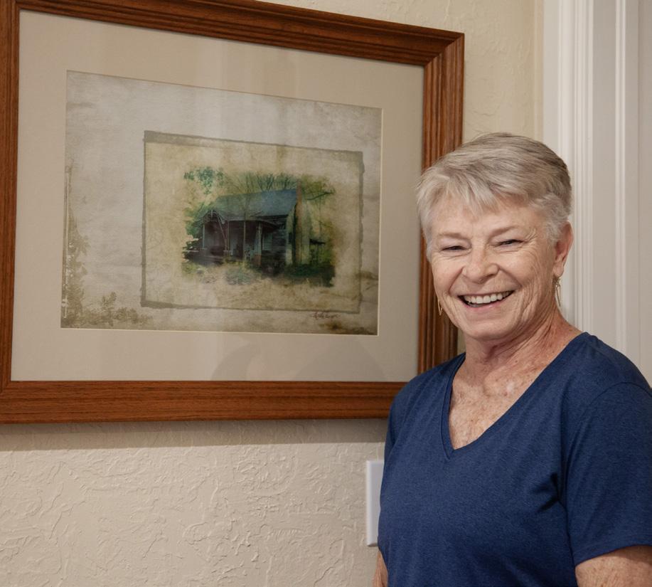 you’re not sure what’s going to come out.” A tabletop painting of orange flowers in a pot is one of those palette knife pieces she’s proud of. She shows off her orig-
