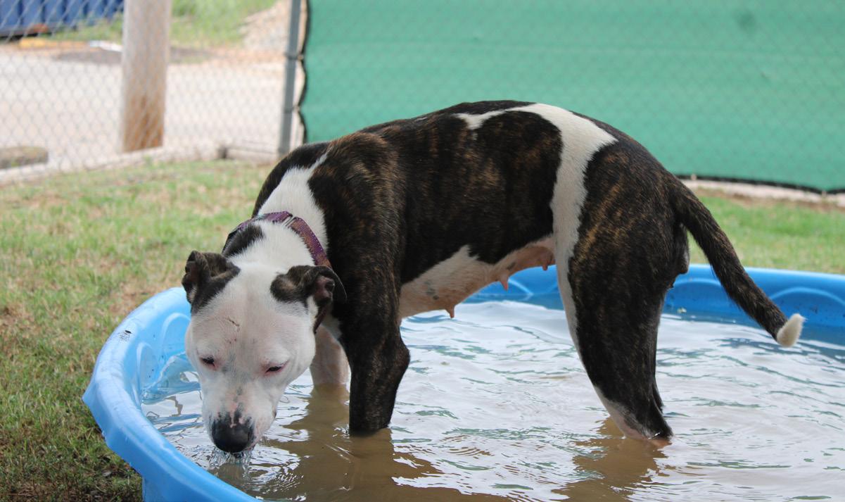 While they play, the dogs can get in and out of little kiddie wading pools and splash around. Several of the little pools were donated, which makes hot summer months cooler, and maybe more fun, for the dogs.