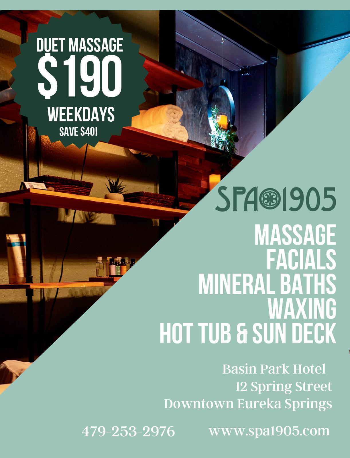 Spa1905 is located on the second floor of the 1905 Basin Park Hotel in downtown Eureka Springs.