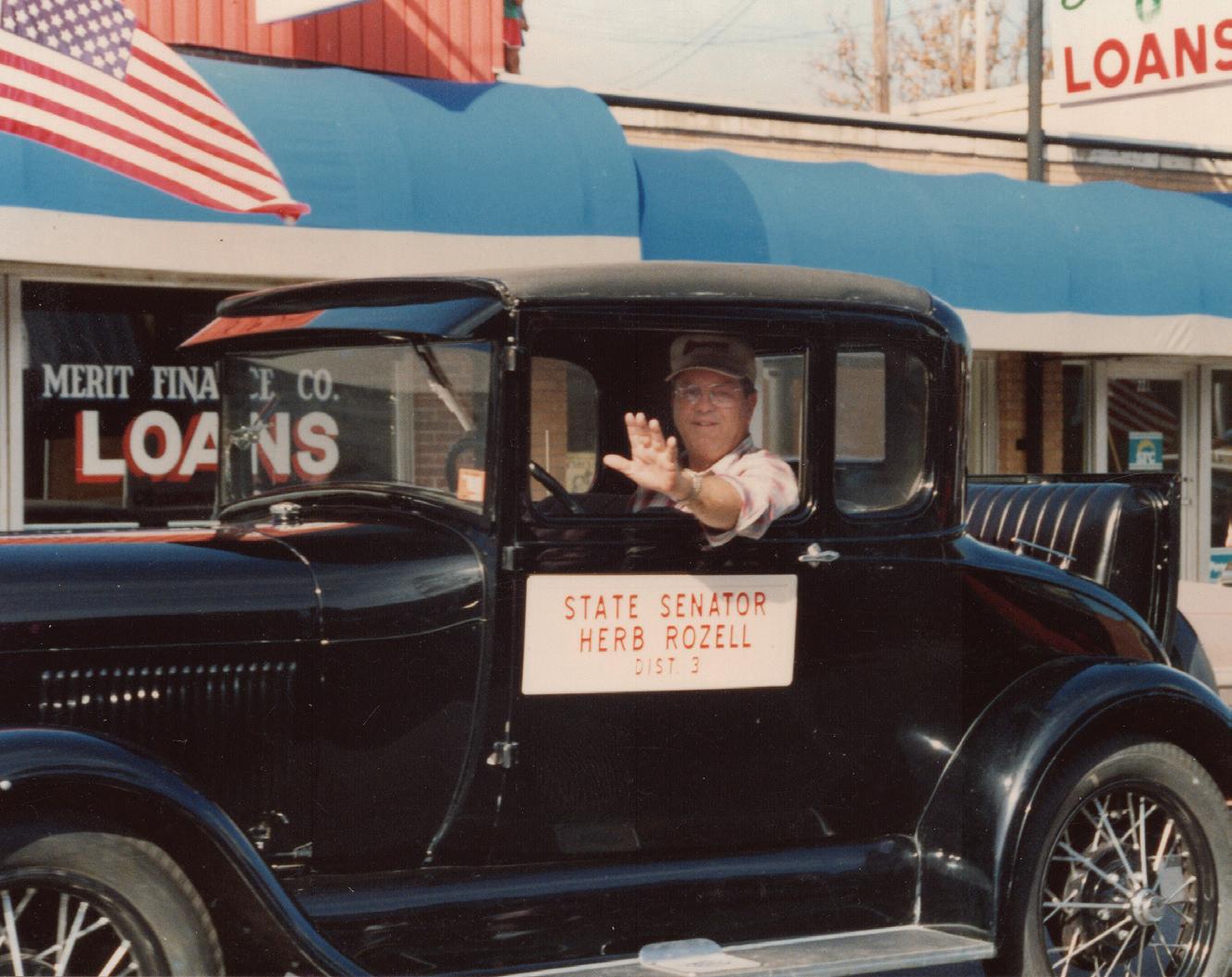 Herb driving an antique car, downtown Tahlequah parade, 1990.
