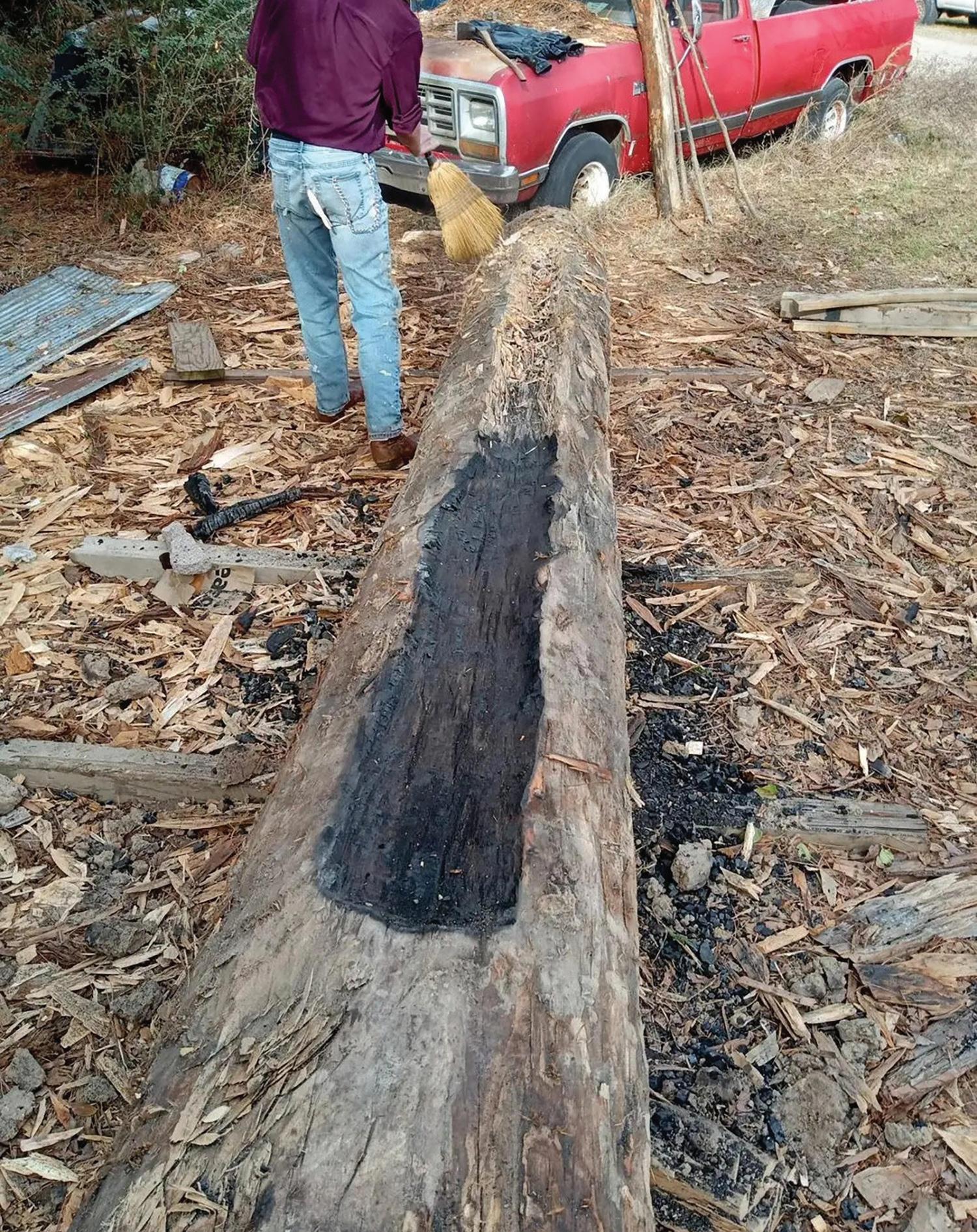 Sacongah Gray’s canoe project, after a round of burning out the log he’s using to make the traditional Cherokee craft.