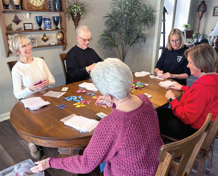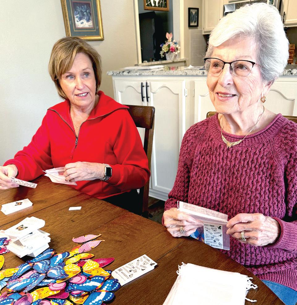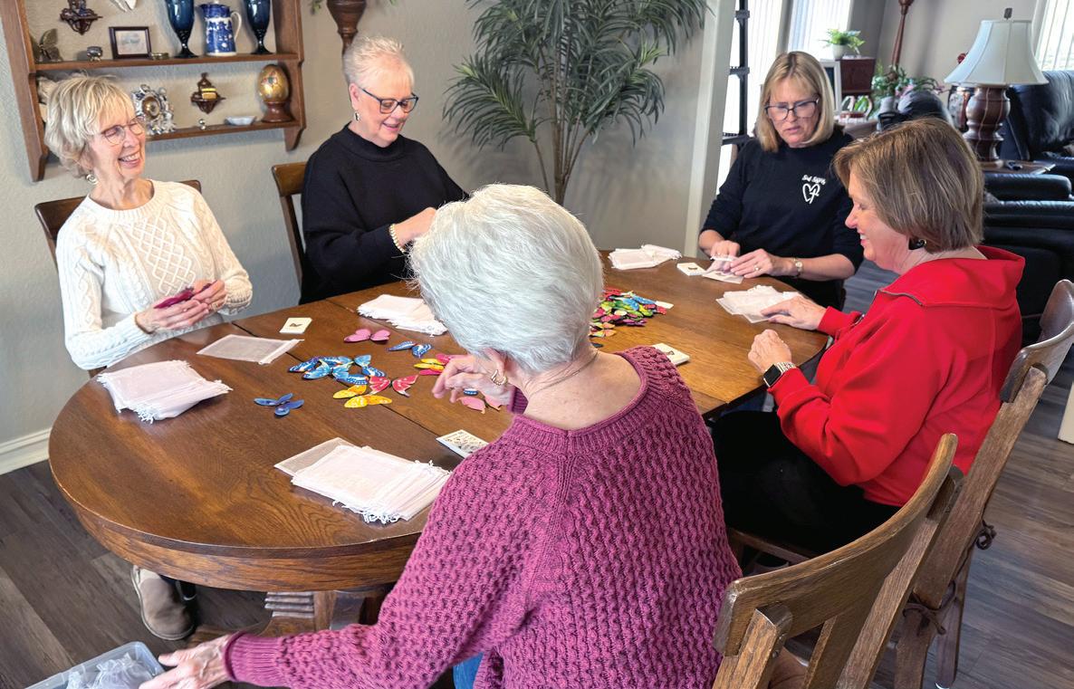 A butterfly ministry founded by Louise Wells brings friends together to place butterflies and faith cards into an organza bag.