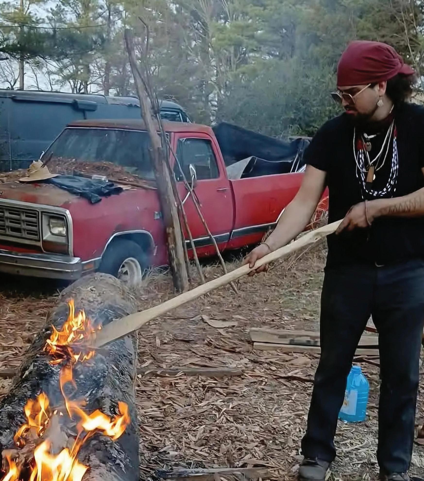 Fire can be a valuable friend when working on a dug-out canoe. Sacongah Gray tends the flames of his traditional Cherokee canoe construction project. Photo courtesy of Sacongah Gray.