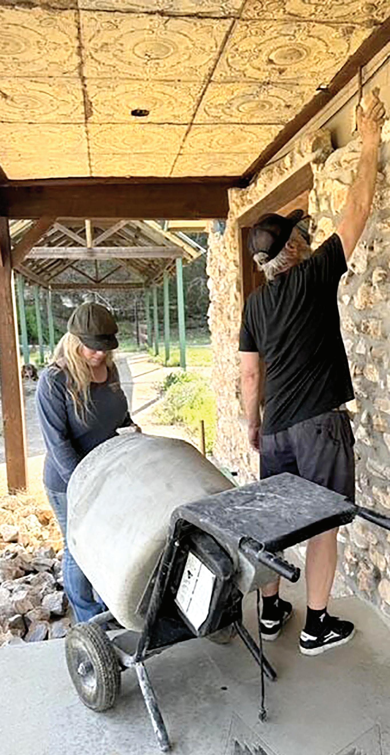 Marcus Olive and Mindy Hendrix replace rocks on the exterior of the camp office.