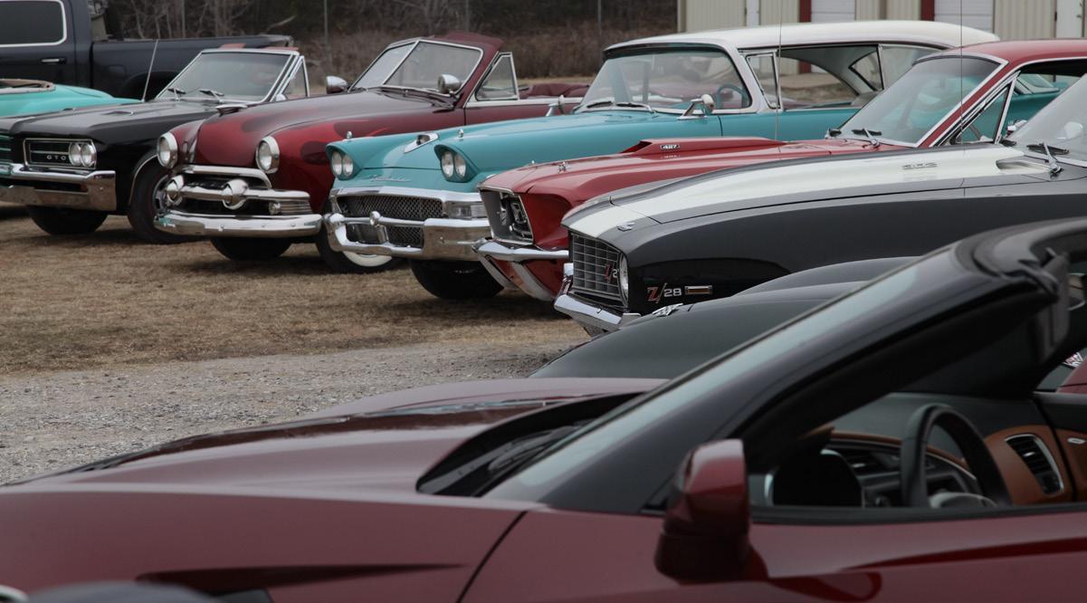 A1956 Crown Victoria in pink and white hugs a corner of a large shop building. Across from it sits an impeccable high gloss black winged American classic 1958 Chevy Impala. In another building, four Corvettes are parked on one side, while classic sports cars like a red 1968 Mustang shipped in from California years ago dominate the space.