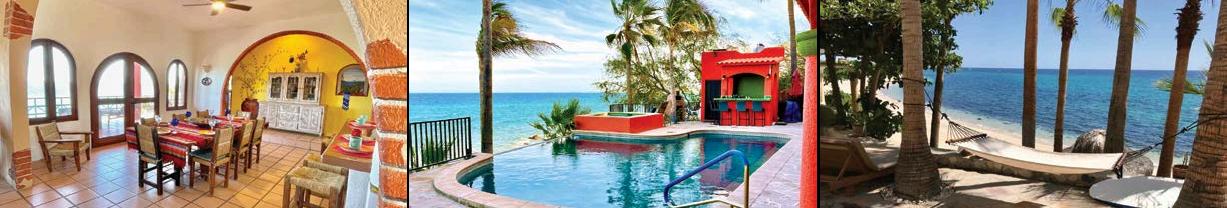 The pool/jacuzzi level with its four individual poolside and ocean view bedrooms, all with full baths, is not just for sleeping It is for relaxing under the palm trees, taking a swim in the pool or unwinding in the jacuzzi Have your favorite beverage at the colorful “cantina bar”, right by the pool, surrounded by chaise lounges with tools at hand for a great dinner to BBQ a fresh caught red snapper or home made pizza in the pizza oven to delight a gathering of family & friends! The four bedrooms are theme colored with wall art, all have pool and ocean views and are steps from the beach The “Cantina” overlooks the pool/jacuzzi and the beautiful Sea of Cortez