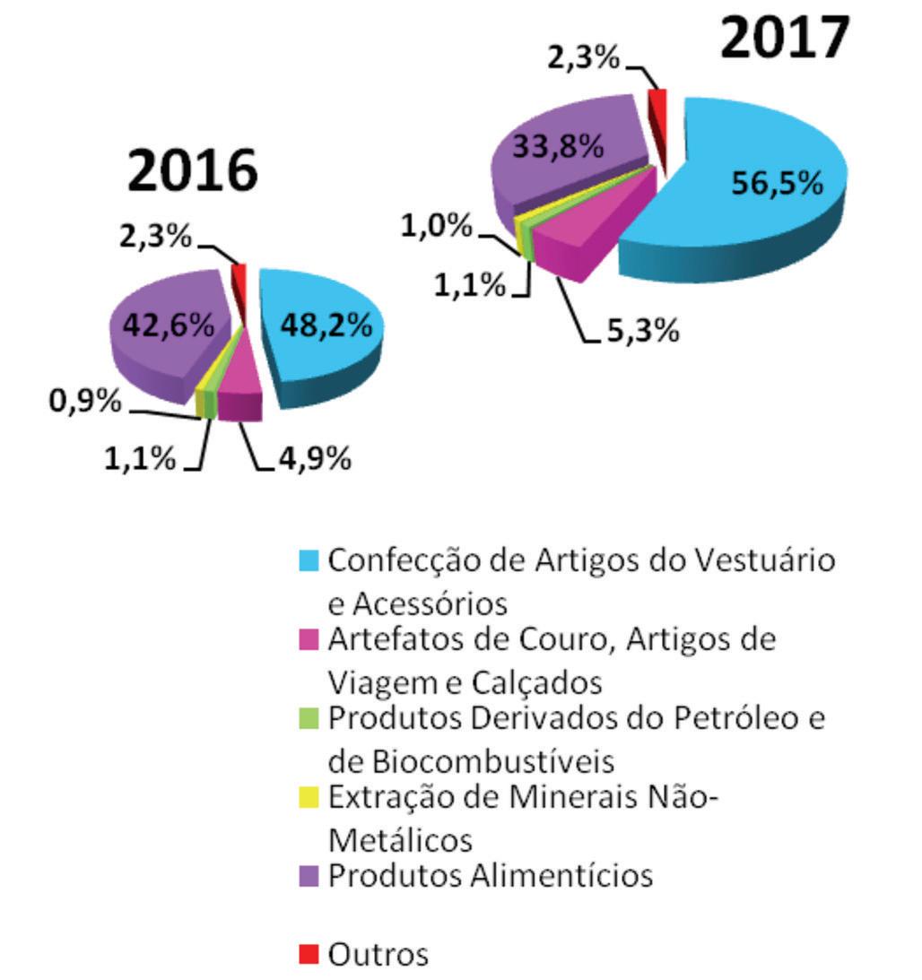 Confecção de Artigos do Vestuário e Acessórios 10.504.162 8.899.170 ↑ 18,0 Artefatos de Couro, Artigos de Viagem e Calçados 978.514 900.196 ↑ 8,7 Produtos Derivados do Petróleo e de Biocombustíveis 211.705 210.358 ↑ 0,6