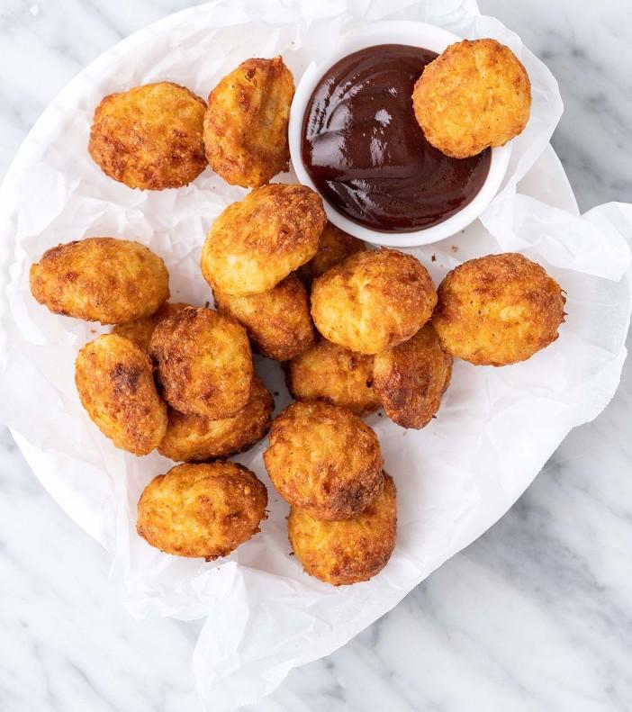 •Use a 1-tablespoon scoop to measure out the mixture. Roll each into a ball, and then flatten each into a chicken nugget.