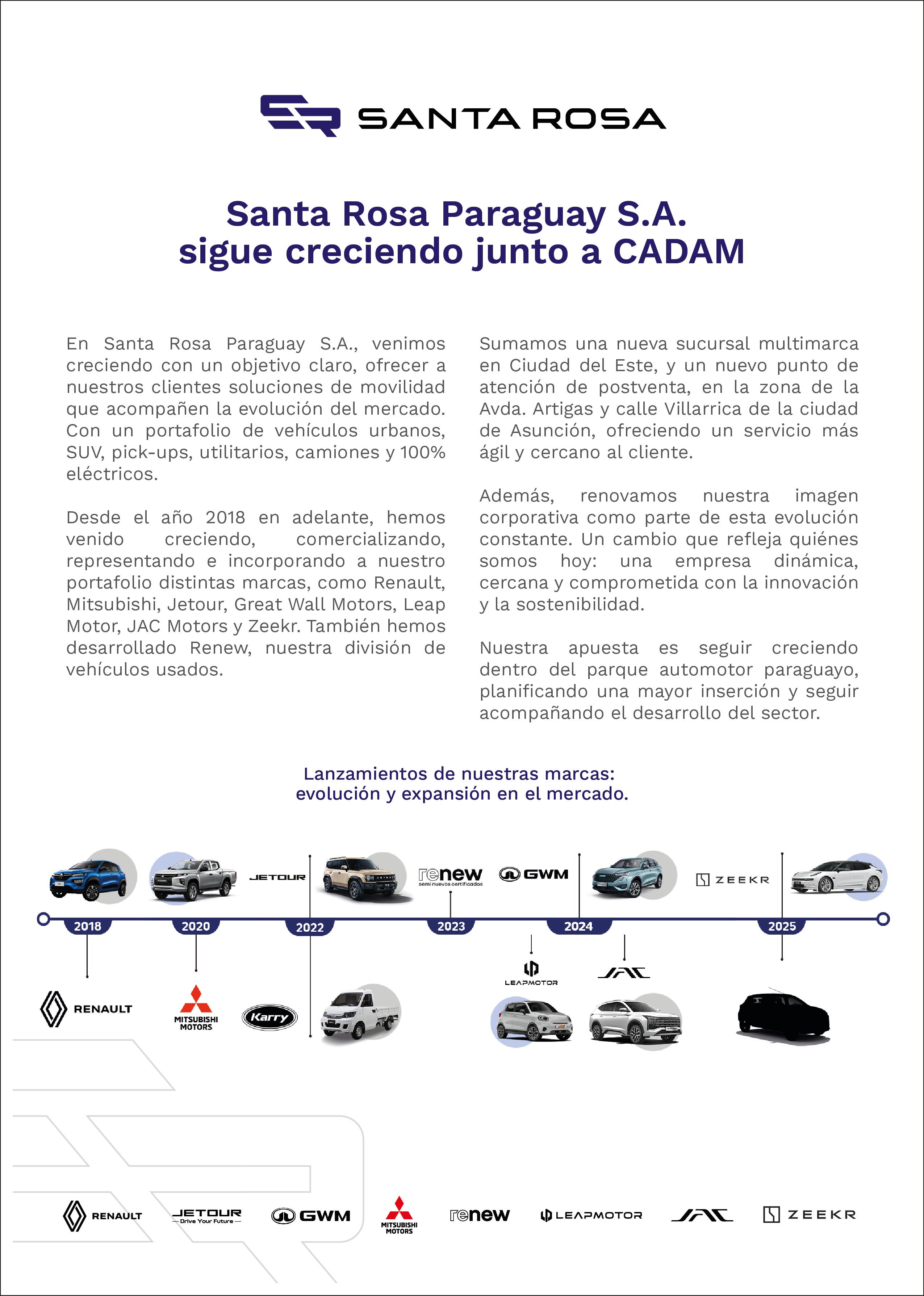 También la electromovilidad es hoy una de las banderas más firmes de Cadam. Si bien el desafío es grande y el camino aún está en construcción, la institución abraza con convicción la transición hacia una movilidad más limpia y eficiente, acompañando la aprobación de la ley marco y promoviendo la integración de Paraguay a la cadena de valor regional. La energía limpia, el potencial industrial y el entusiasmo de los socios son pilares para avanzar hacia un futuro sostenible.