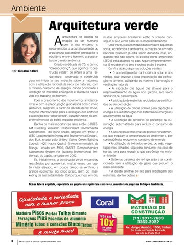 arquitetura se baseia na relação do ser humano com o seu entorno e, nesse sentido, a arquitetura verde ou arquitetura sustentável pressupõe o equilíbrio entre o homem, a arquite tura e o meio ambiente. Criado na década de 70, o termo “Greenbuilding”, que significa “cons Por Ticiana Fahel trução verde”, se refere a uma arquitetura projetada e construída para minimizar o seu impacto sobre a natureza, com a utilização racional de recursos naturais, com o mínimo consumo de energia, dando prioridade a utilização de materiais ecológicos e saudáveis para a vida e o trabalho do homem. Com o crescimento dos movimentos ambienta listas e com a preocupação globalizada com o meio ambiente, surgiram, a partir da década de 90, movimentos internacionais para a avaliação dos edifícios e a adoção dos “selos verdes”, caracterizando os empreendimentos de baixo impacto ambiental. Dentre os mais importantes selos estão: o BREEAM (Building Research Establishment Enviromental Assessment), do Reino Unido, lançado em 1990; o LEED (Leadership in Energy and Enviromental Design), dos EUA, criado pelo United States Green Building Council; HQE (Haute Qualité Environnementale), da França, criado em 1996; CASBEE (Comprehensive Assessment System for Building Enviromental Efficiency), do Japão, lançado em 2002. Se, inicialmente, a construção verde encontrou resistências por apresentar, muitas vezes, um custo inicial elevado, em pouco tempo se verificou a grande economia no longo prazo, além do marketing da sustentabilidade. Daí porque, hoje em dia,