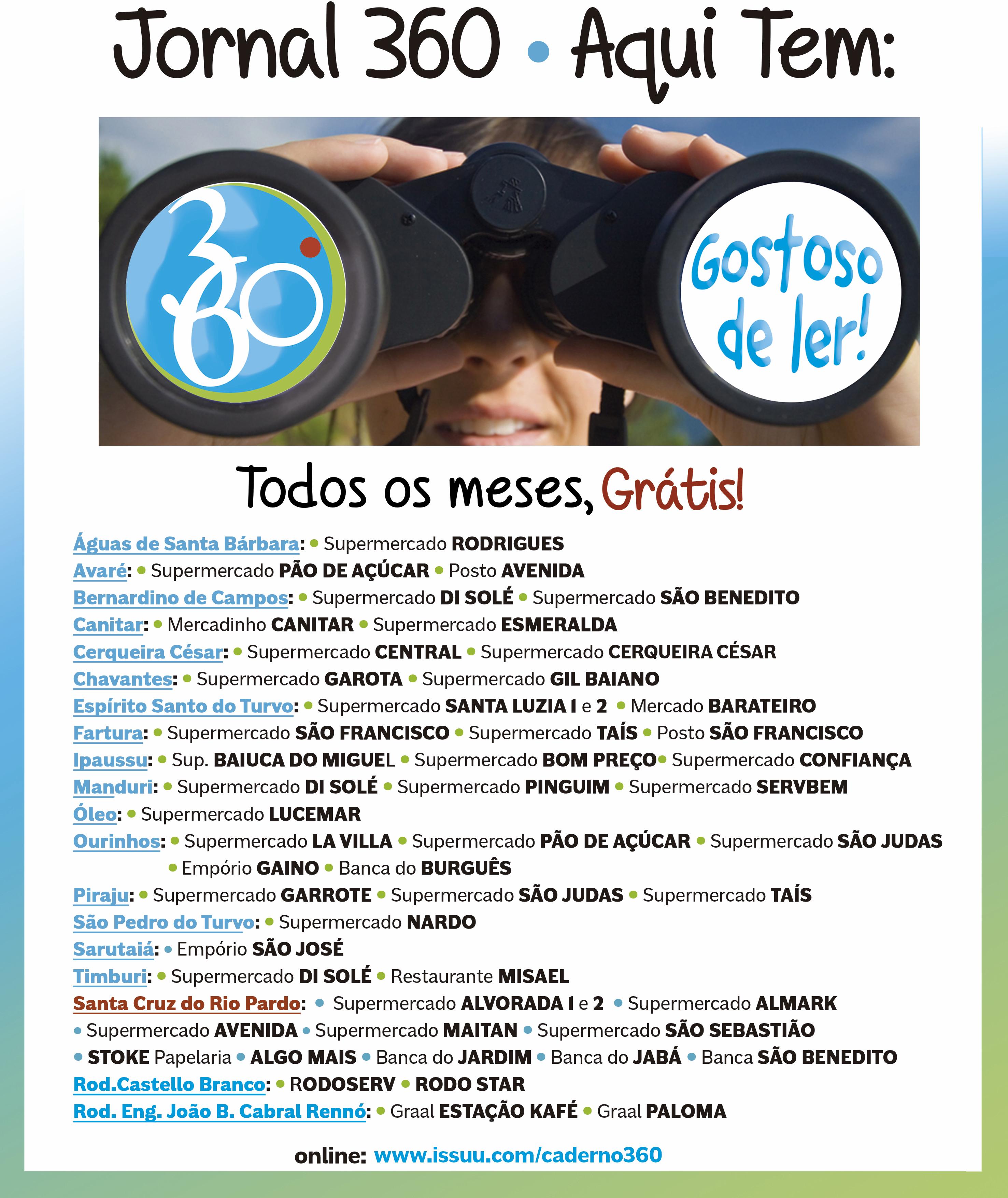 O jornal 360 é uma publicação da eComunicação. Todos os direitos reservados. Distribuição: gratuita. Tiragem: 3 mil exemplares. Circulação: mensa. Redação-Colaboradores: Flávia Rocha Manfrin ˙editora, diagramadora e jornalista responsávelMtb 21563˚, Fernanda Lira, Leonardo Medeiro, Angela Nunes e Maurício Salemme Corrêa ˙colunistas˚, Sabato Visconti ˙ilustrador˚, Odette Rocha Manfrin ˙receitas e separação˚, Camila Jovanolli ˙transcrições˚. Impressão: Fullgraphics. Artigos assinados são de responsabilidade de seus autores. Endereço: R. Cel. Julio Marcondes Salgado, 147CEP 18900-007 - Santa Cruz do Rio Pardo/SP.