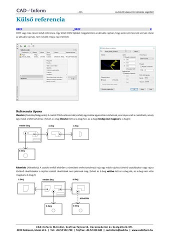 Referencia típusa Illesztés (Csatolás/Beágyazás): A csatolt DWG-referenciák (xrefek) egymásba ágyazottak is lehetnek, azaz olyan xref is csatolható, amely egy másik xrefet tartalmaz. (Mivel a c.dwg illesztve lett az a.dwg-hez, az a.dwg mindig viszi magával a c.dwg-t)