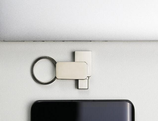 Praktischer on-the-go Speicher-Stick mit USB-A und Type-C Anschluss. Für alle modernen Smartphones, Computer oder Tablets. Der robuste Metall-Drehbügel mit Aufhängungsmöglichkeit für den Schlüsselanhänger ermöglicht ein simples Öffnen bzw. Abdecken.