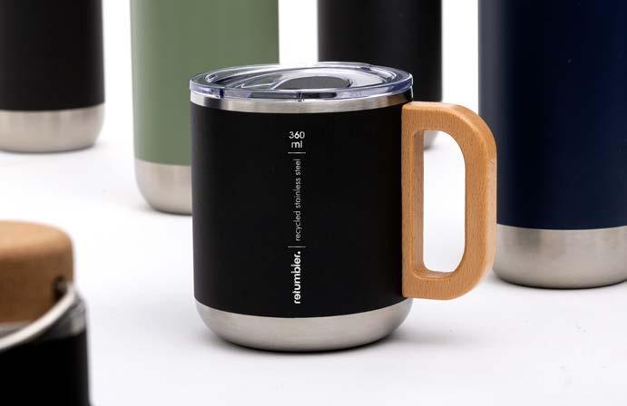 Thermobecher aus recyceltem Edelstahl mit Holz-Henkel.
