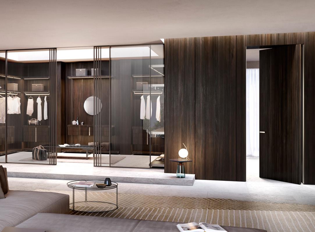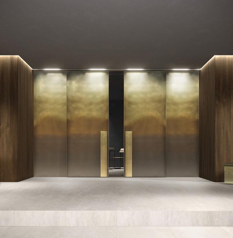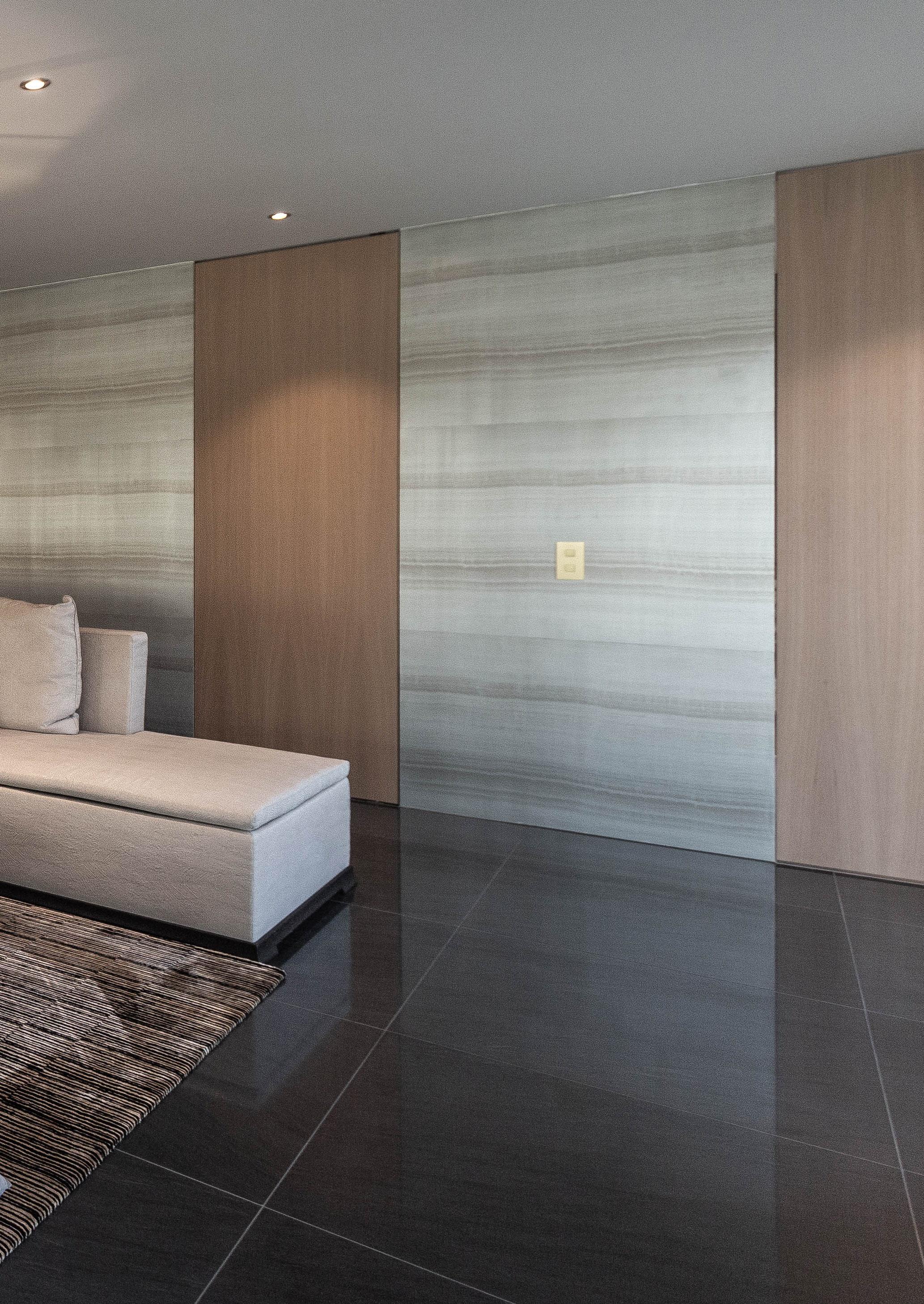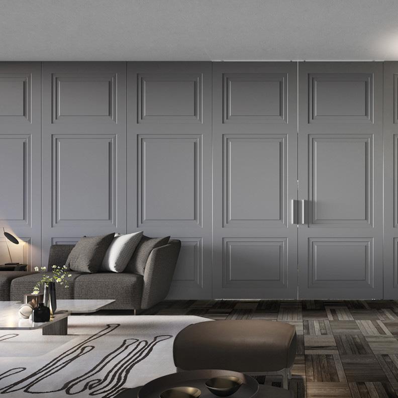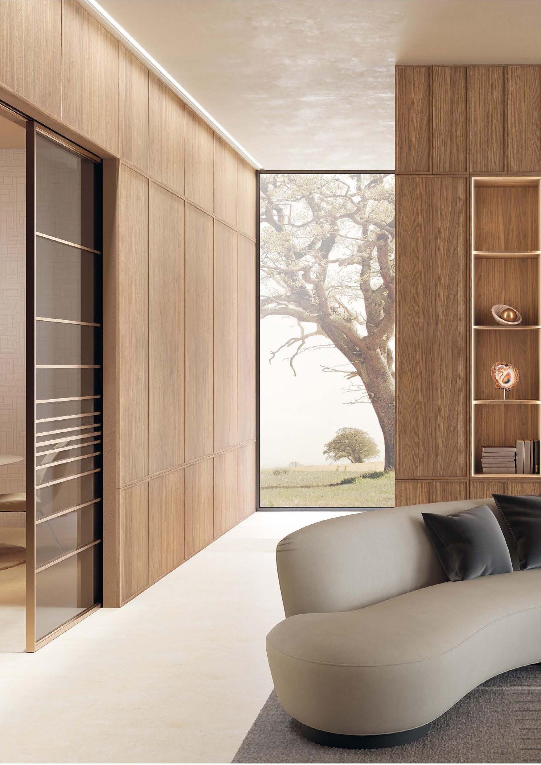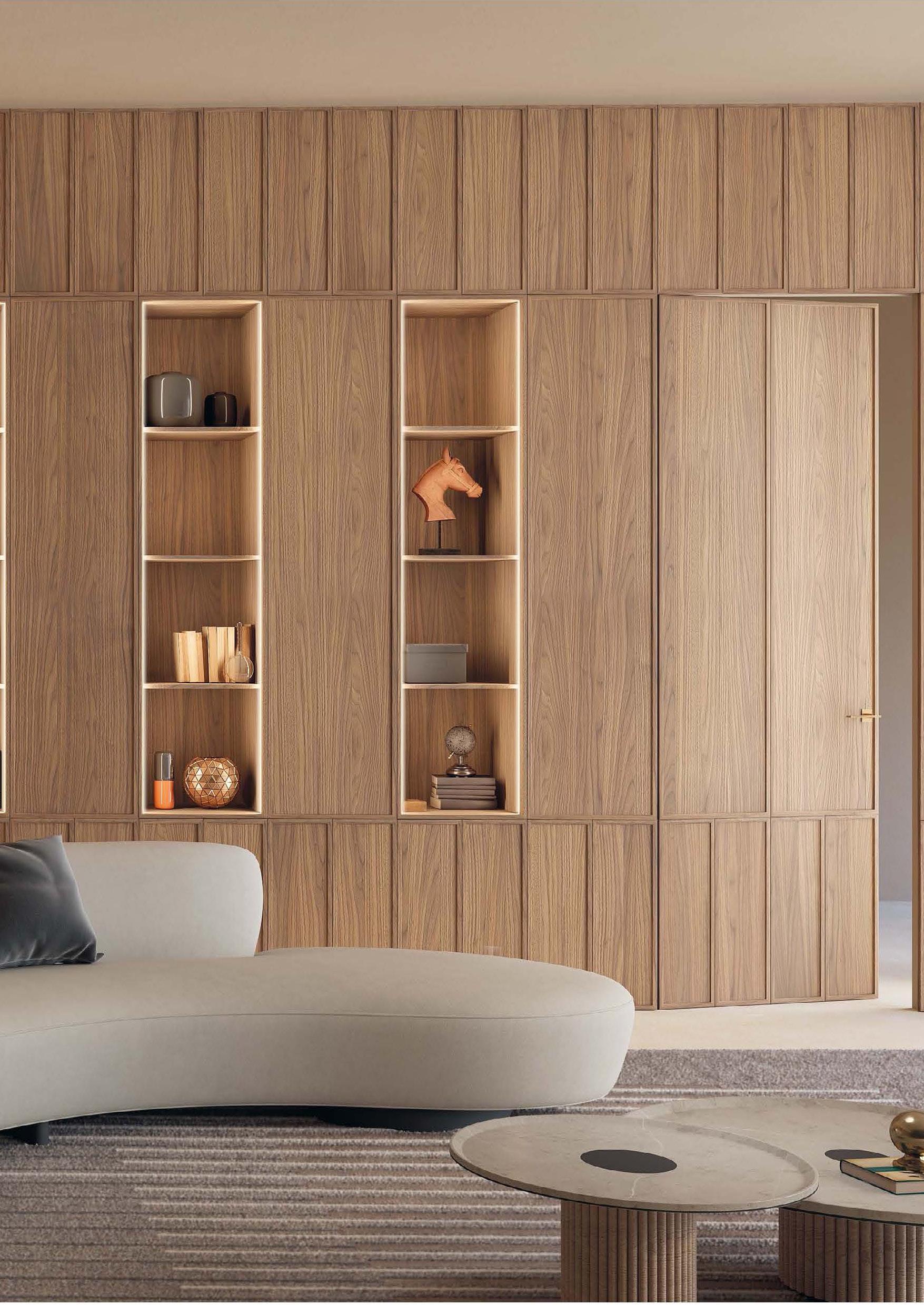 Ein System, das es ermöglicht, Wände maßgeschneidert und im Einklang mit der Oberfläche der Türen zu verkleiden. Wandverkleidungen und Paneele, mit handwerklicher Sorgfalt veredelt, schaffen einzigartige und immersive Raumwelten.