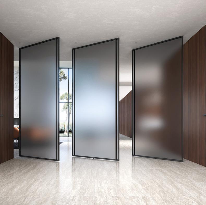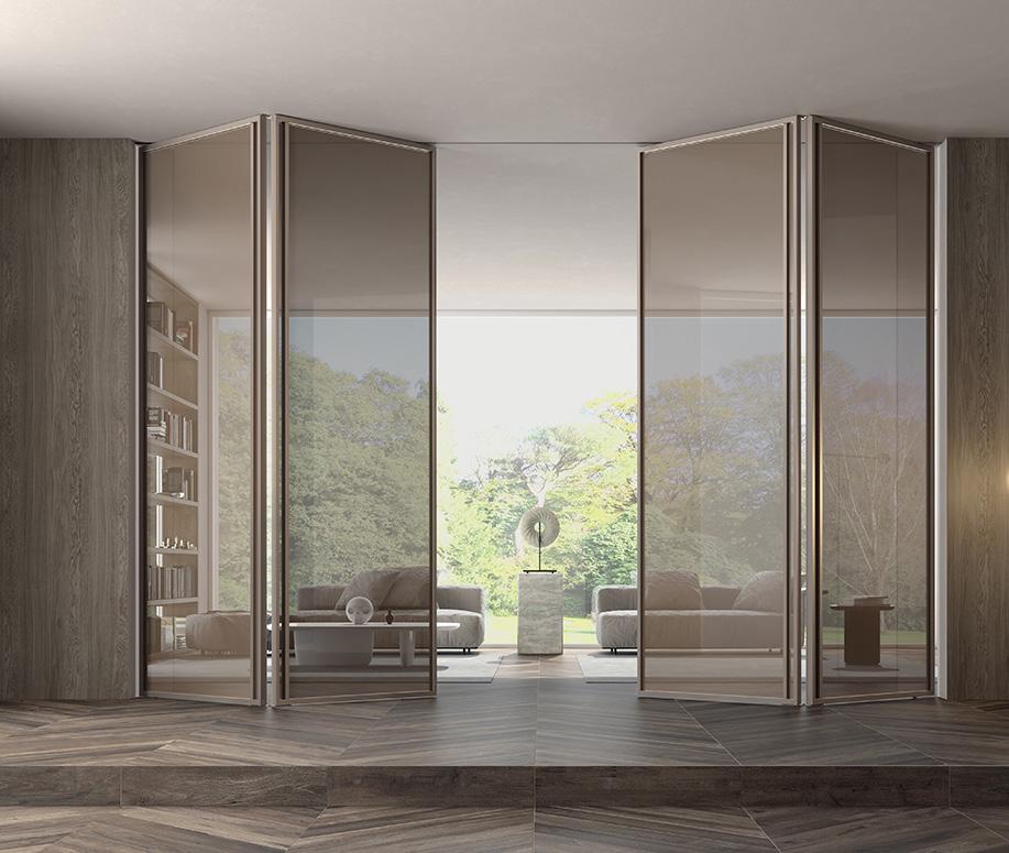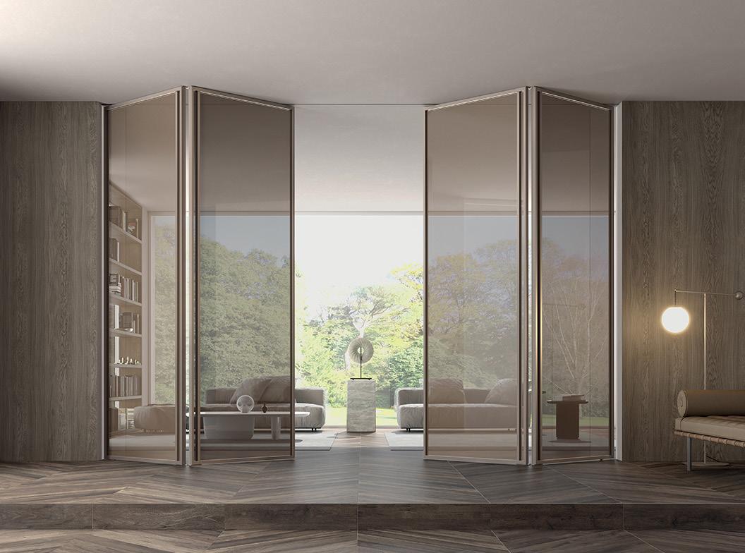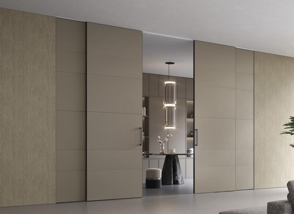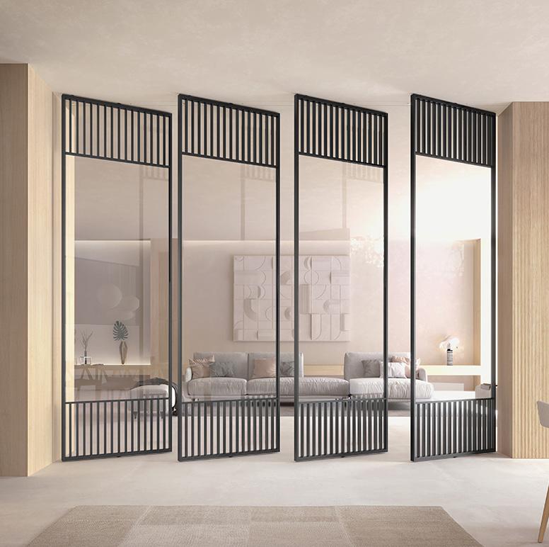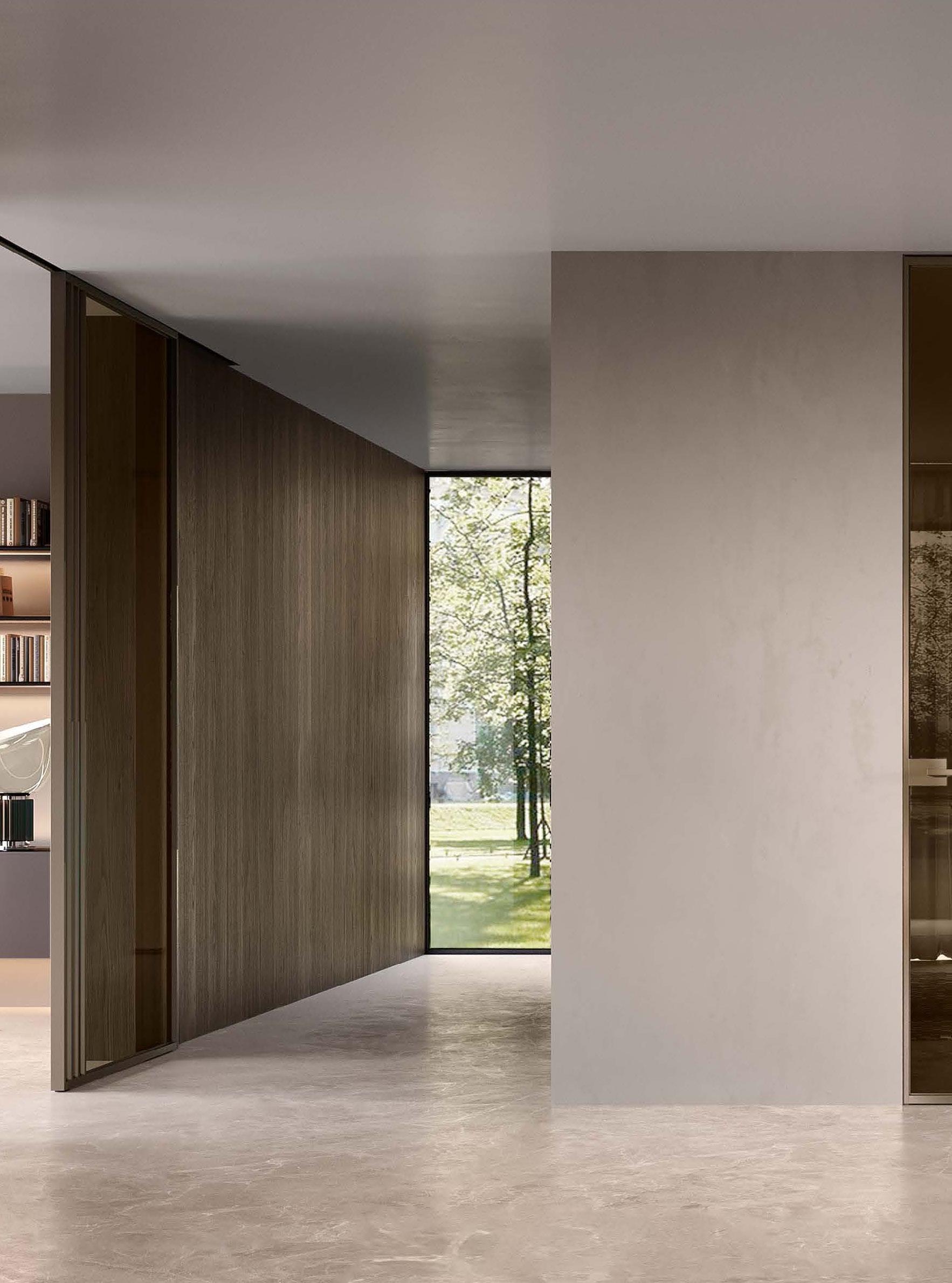 Die Produktpalette von Barausse umfasst flächenbündige Türen zum Drücken und zum Ziehen, platzsparende Lösungen wie Innenschiebetüren, Außenschiebetüren und Falttüren, Pivottüren und Drehtüren.