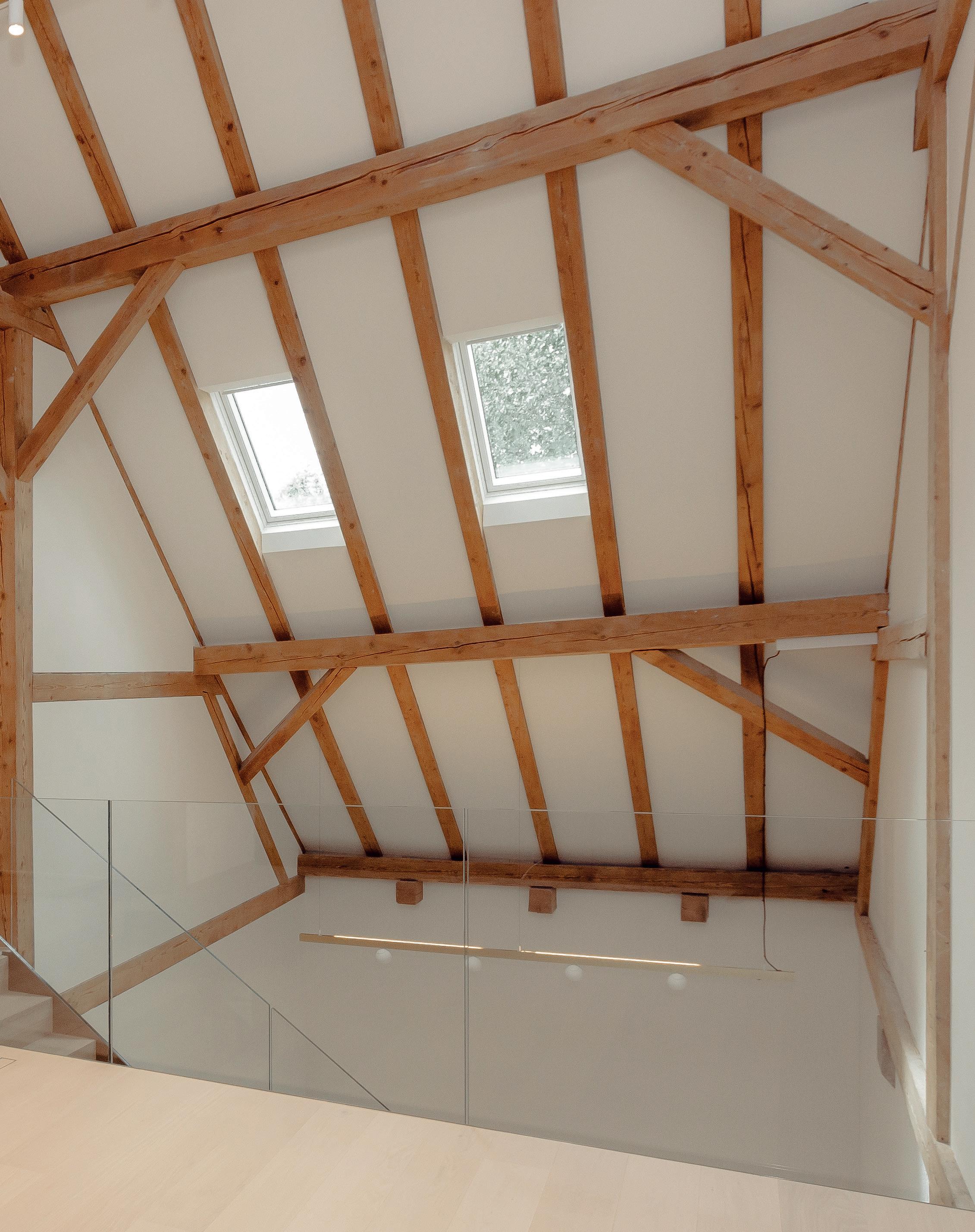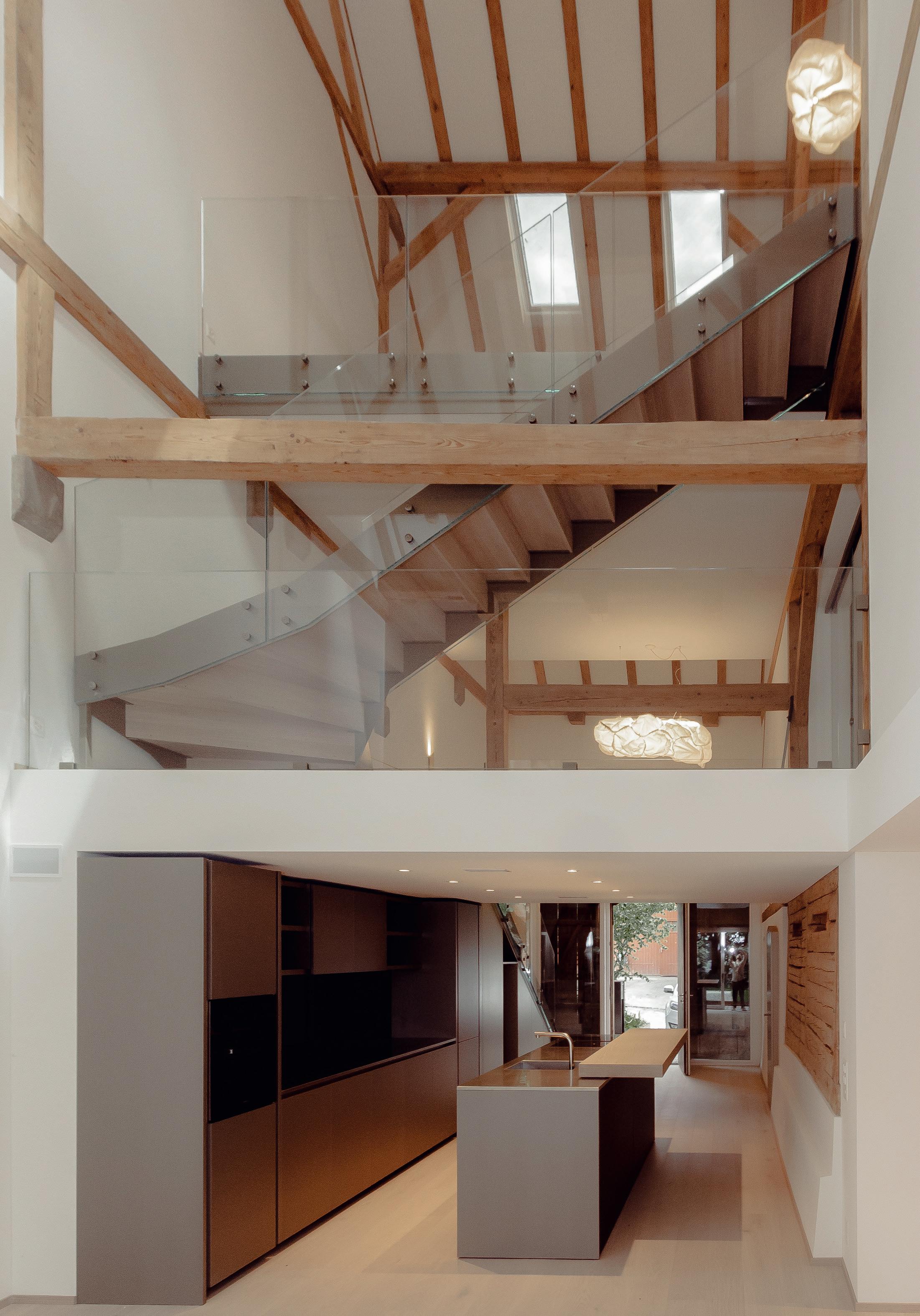 Charakteristisch ist die dreidimensionale Verschachtelung der Räume: Versetzte Ebenen, Blickbeziehungen über Lufträume hinweg und spannende Übergänge lassen eine Architektur entstehen, die nicht nur funktional, sondern auch atmosphärisch überzeugt. So wird die Scheune nicht einfach bewohnt – sie wird erlebt.