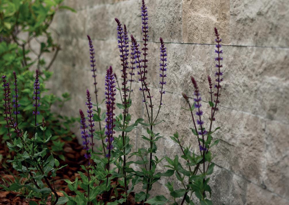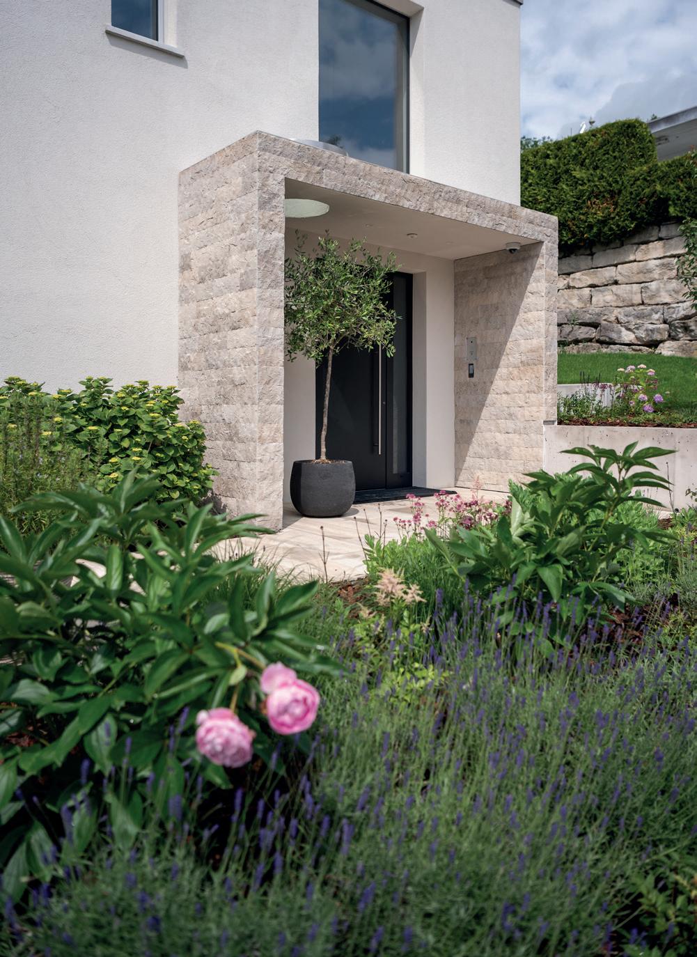 Alle Farben – von zartem Grün bis zu sanften Creme- und Violetttönen – greifen die Farbwelt des Hauses auf und machen den Garten zu einem Teil des architektonischen Ganzen.