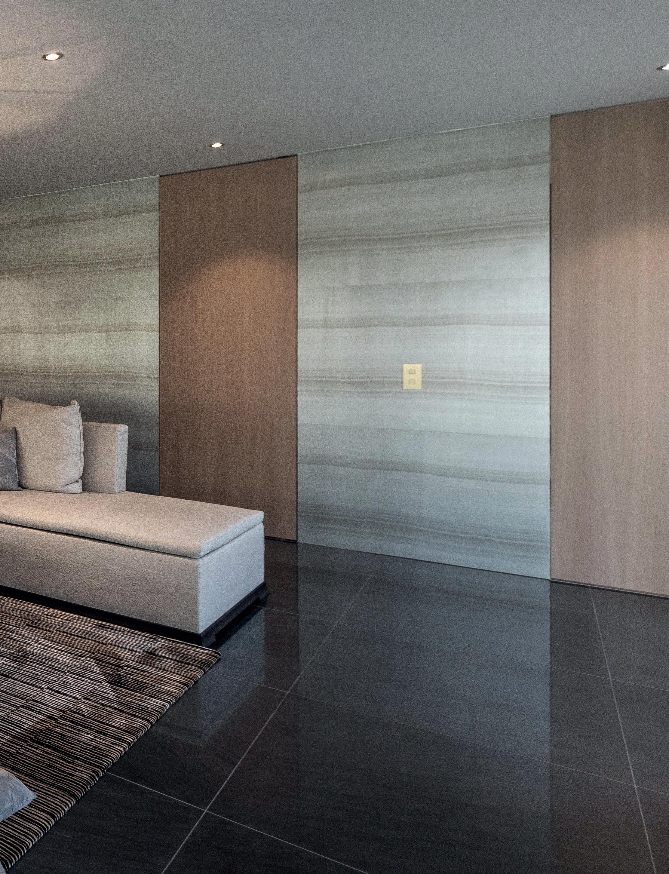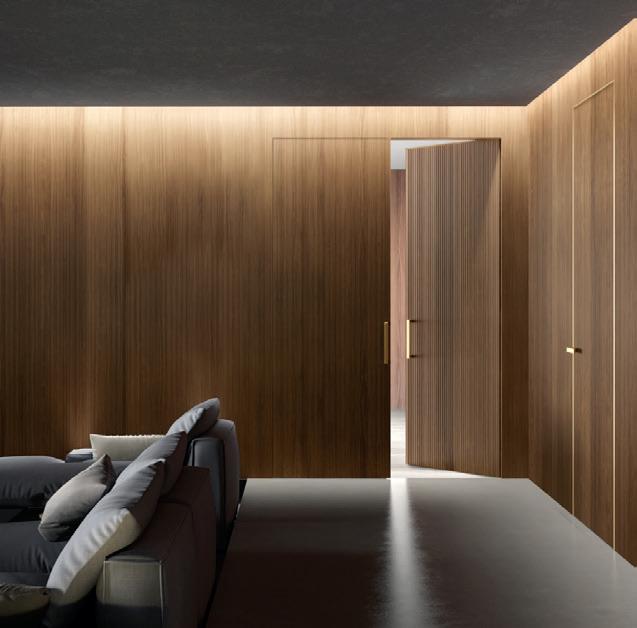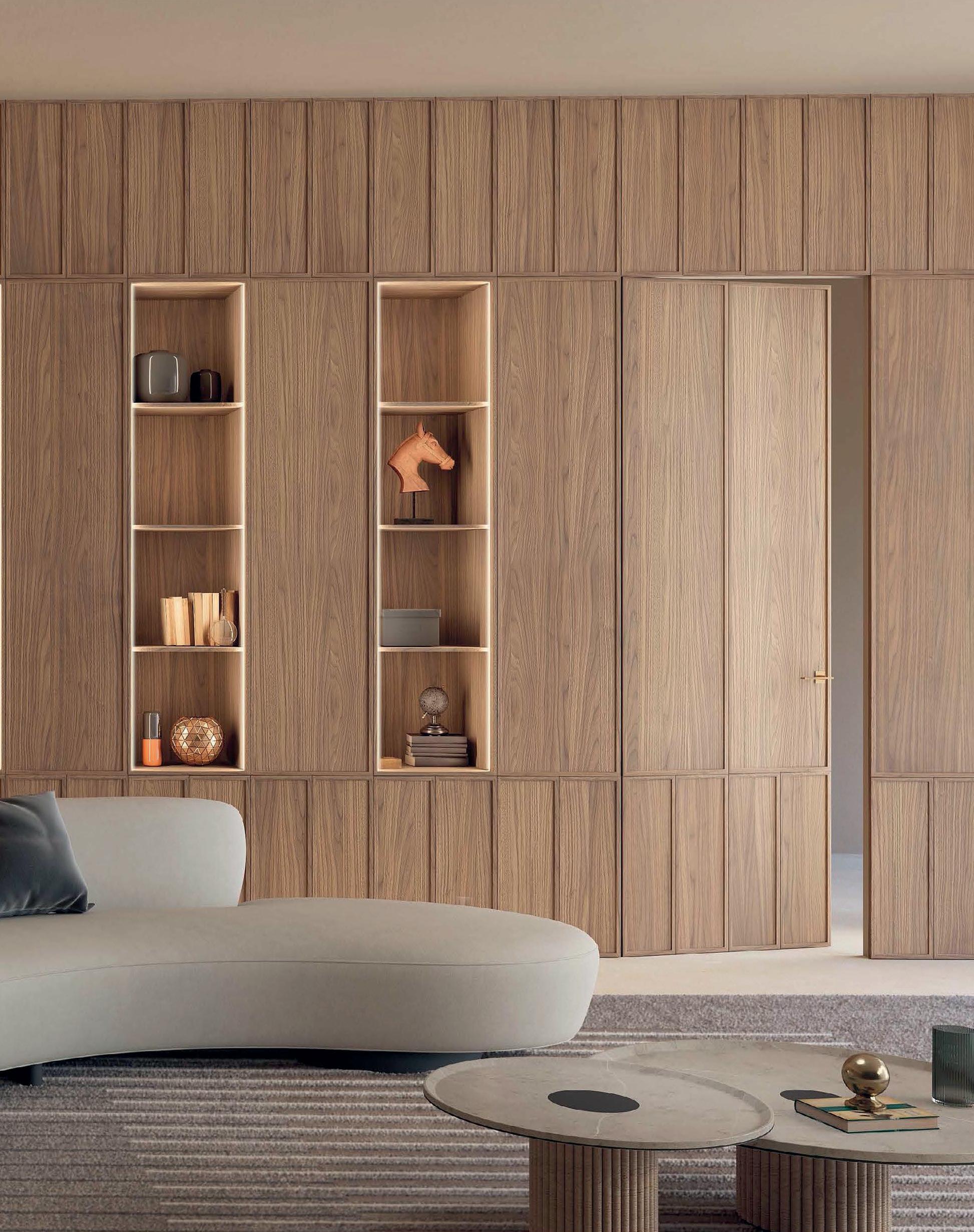 Ein System, das es ermöglicht, Wände massgeschneidert und im Einklang mit der Oberfläche der Türen zu verkleiden. Wandverkleidungen und Paneele, mit handwerklicher Sorgfalt veredelt, schaffen einzigartige und immersive Raumwelten.