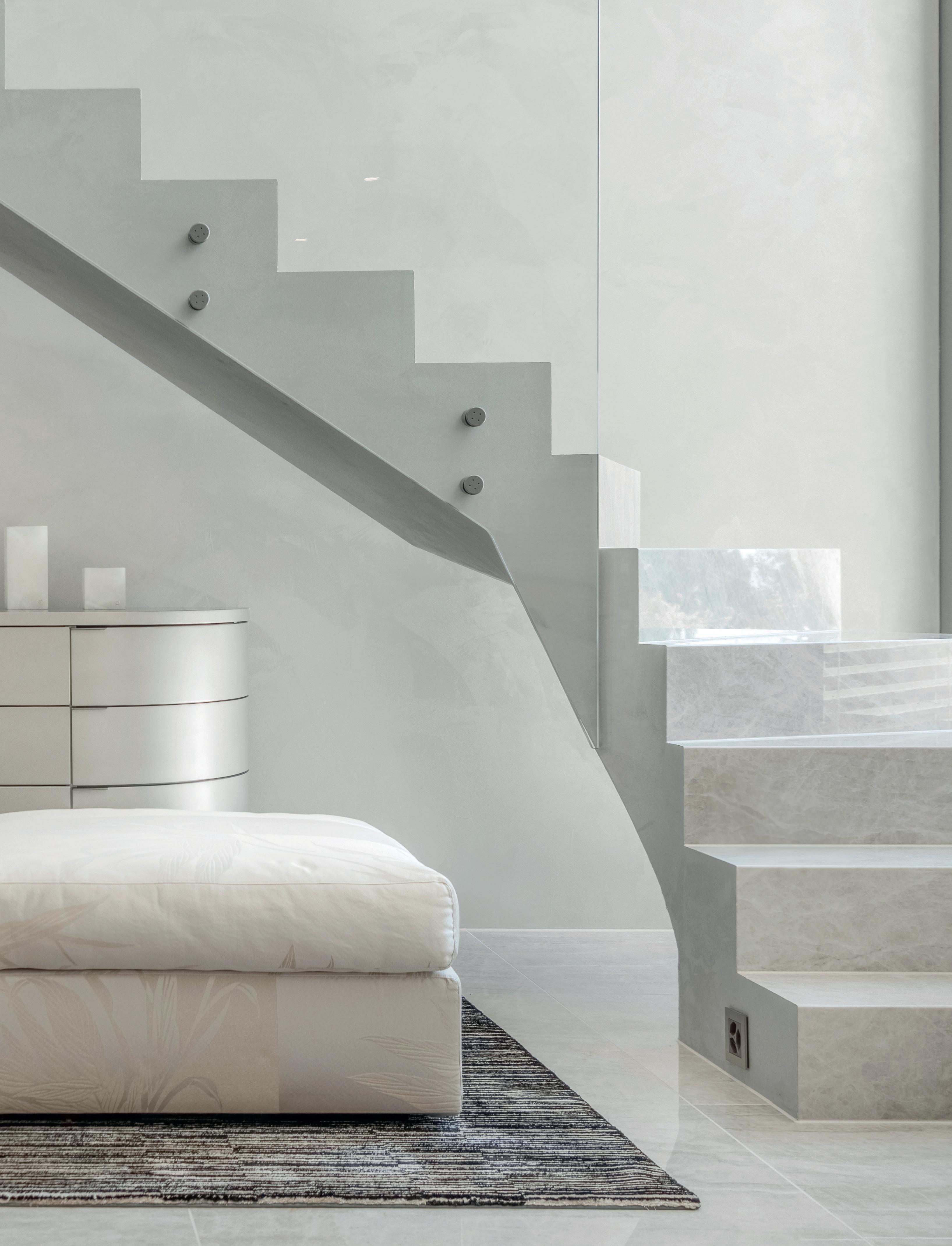 Die klare Architektursprache respektiert die Geschichte des Gebäudes, interpretiert sie jedoch auf zeitgemässe Weise neu. Dabei entsteht ein Wohnraum, der nicht konventionell gegliedert ist, sondern durch seine Ebenen lebt – ein Wechselspiel aus Rückzug und Grosszügigkeit.