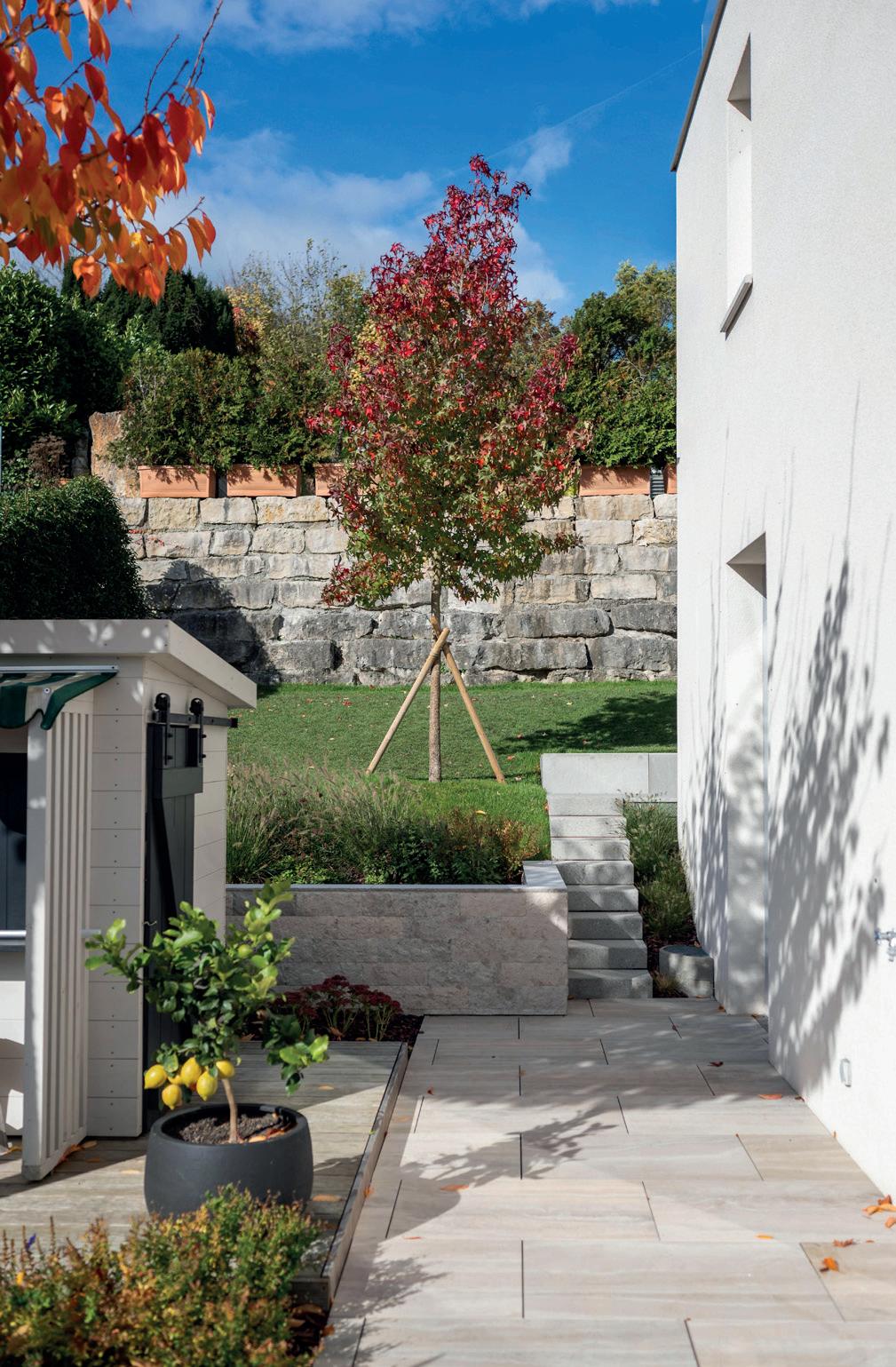 Die unterschiedlichen Höhen des Gartens stellten die Planer zunächst vor eine Herausforderung –und boten zugleich die Möglichkeit für Tiefe und Struktur. Neue Stützmauern nehmen das Gelände behutsam auf und formen Terrassen, die den Garten räumlich ordnen, ohne ihn zu unter-