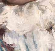 Ampliación de la imagen visible de la obra Retrato infantil con flores del autor Ignacio Pinazo, donde se puede apreciar el trazo del pincel y la textura del lienzo.