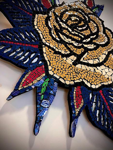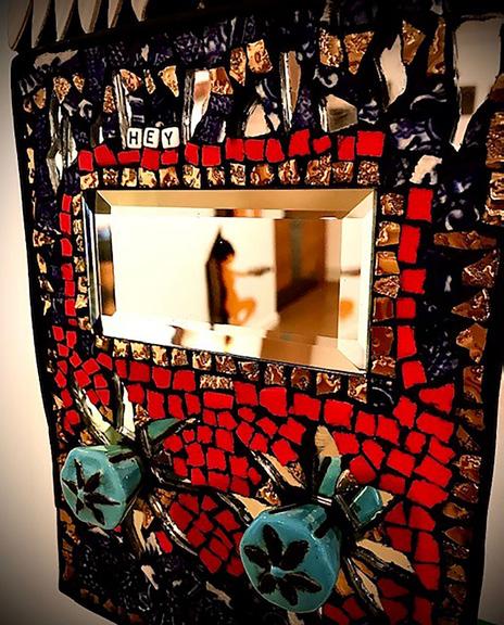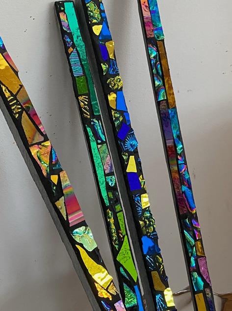 I am truly passionate about glass. Its colour, vibrancy and as the basis of my creative work. The material I most love to use is dichroic glass. Quite rare to use it unfused, it’s expensive but so worth it. All the glass I use is opaque and either has an iridescent or opalescent sheen which is effective and attractive in a mosaic. With this glass I make mosaics on tile or slate for the garden, on silver plate and